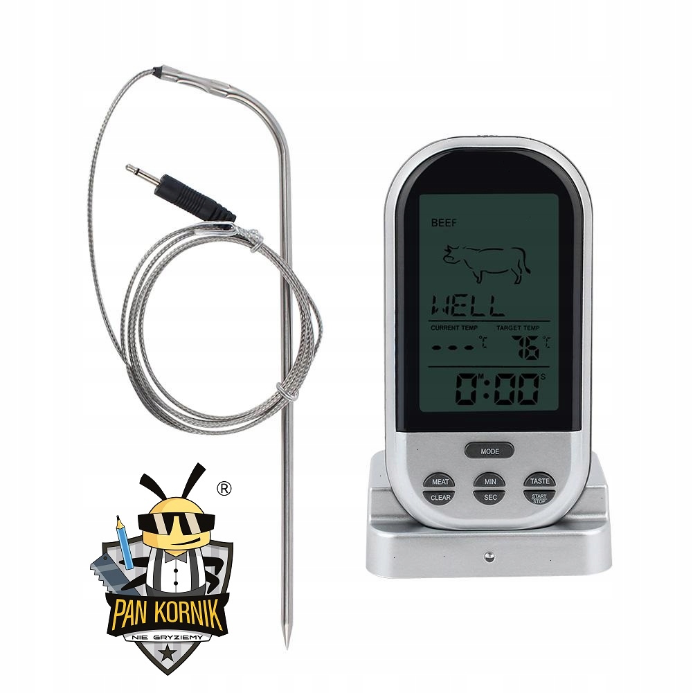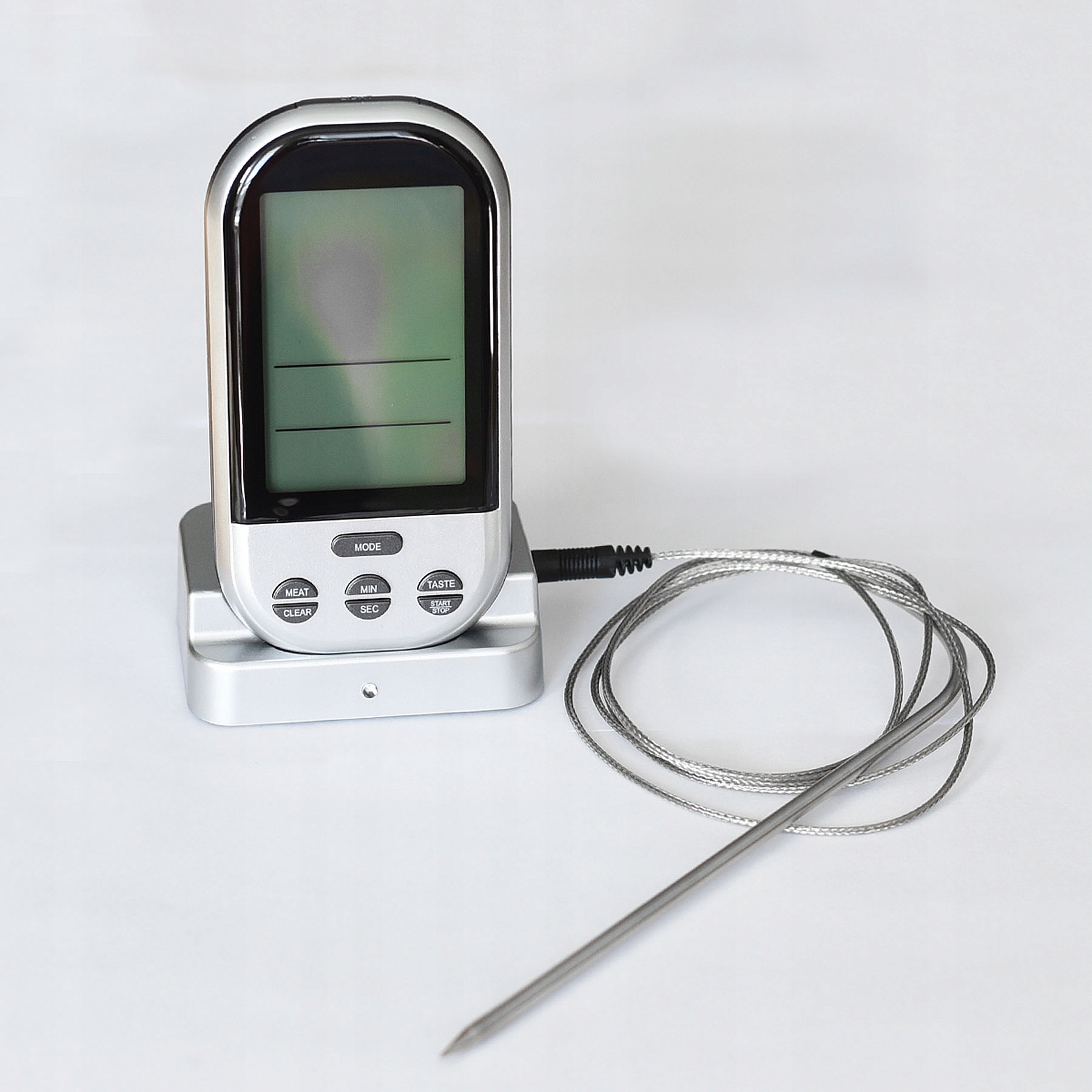Элегантный электронный кухонный термометр на подставке с пищевым щупом. Это облегчит приготовление блюд в коптильне и на гриле. Он будет указывать температуру от 0 до 250°C. Термометром очень приятно пользоваться. Незаменим при приготовлении мяса, особенно стейков разной степени прожарки. Термометр изготовлен из прочных материалов и легко чистится. Когда данный продукт достигает указанной температуры, термометр подает сигнал тревоги.