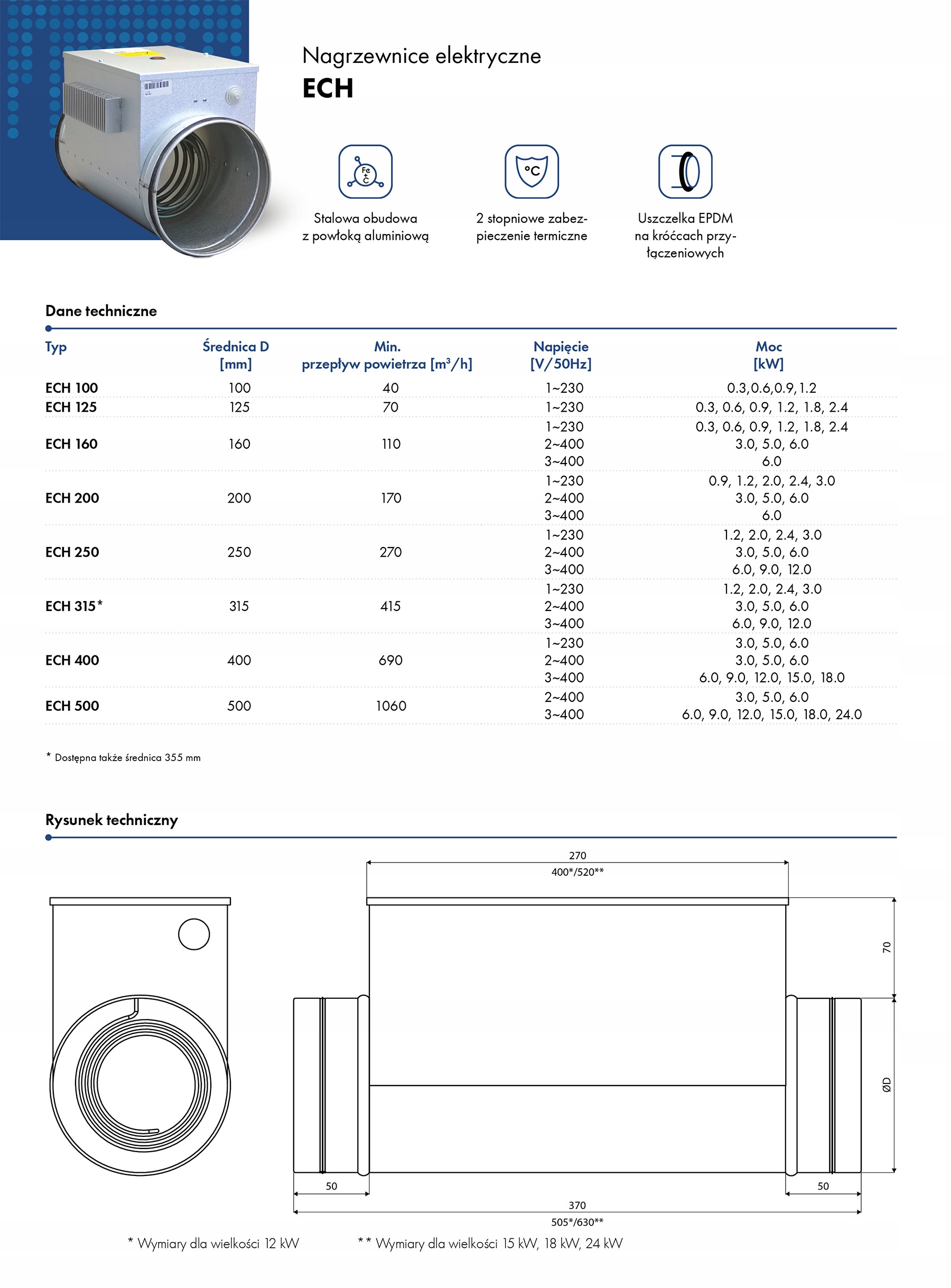 ECH – электрический канальный обогреватель без встроенной автоматики. Мощность обогрева обогревателя можно регулировать с помощью внешнего регулятора HRK. Обогреватели ECH предназначены для установки в воздуховоды круглого сечения. Они выпускаются с типичным диаметром вентиляции от 100 до 500 мм и мощностью от 0,3 до 24,0 кВт.