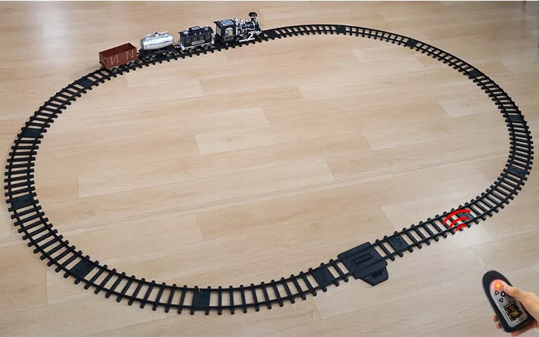 В комплект входит рельса с 39 элементами, локомотив, 3 грузовых вагона, кулер для воды и пульт дистанционного управления.