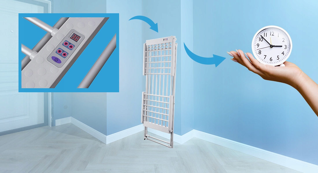 Электрическая сушилка для белья N'oveen — идеальное решение для занятых людей, у которых нет времени на традиционную сушку на открытом воздухе или ожидание идеальной погоды, чтобы стирать больше белья. Это существенно сокращает время сушки, для высыхания всего белья достаточно около 4 часов. Его эффективность особенно можно оценить в зимние месяцы или в плохую погоду, когда температура низкая и не способствует сушке белья.