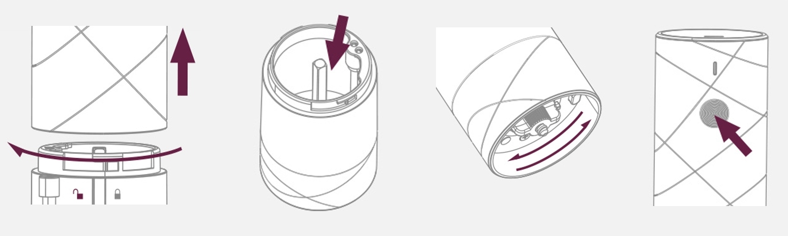 1. Отвинтить контейнер для порошка; 2. Добавьте перец; 3. Выберите степень помола; 4. Началось.
