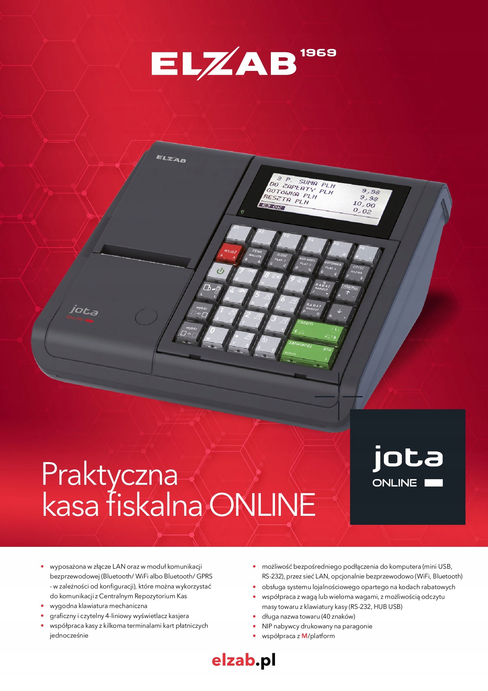 ELZAB Jota ONLINE входит в стандартную комплектацию. оснащен разъемом LAN, который можно использовать для связи с Центральным кассовым хранилищем. Связь с CRK можно расширить за счет беспроводных соединений благодаря дополнительным аксессуарам, таким как модули Bluetooth/WiFi или Bluetooth/GPRS.