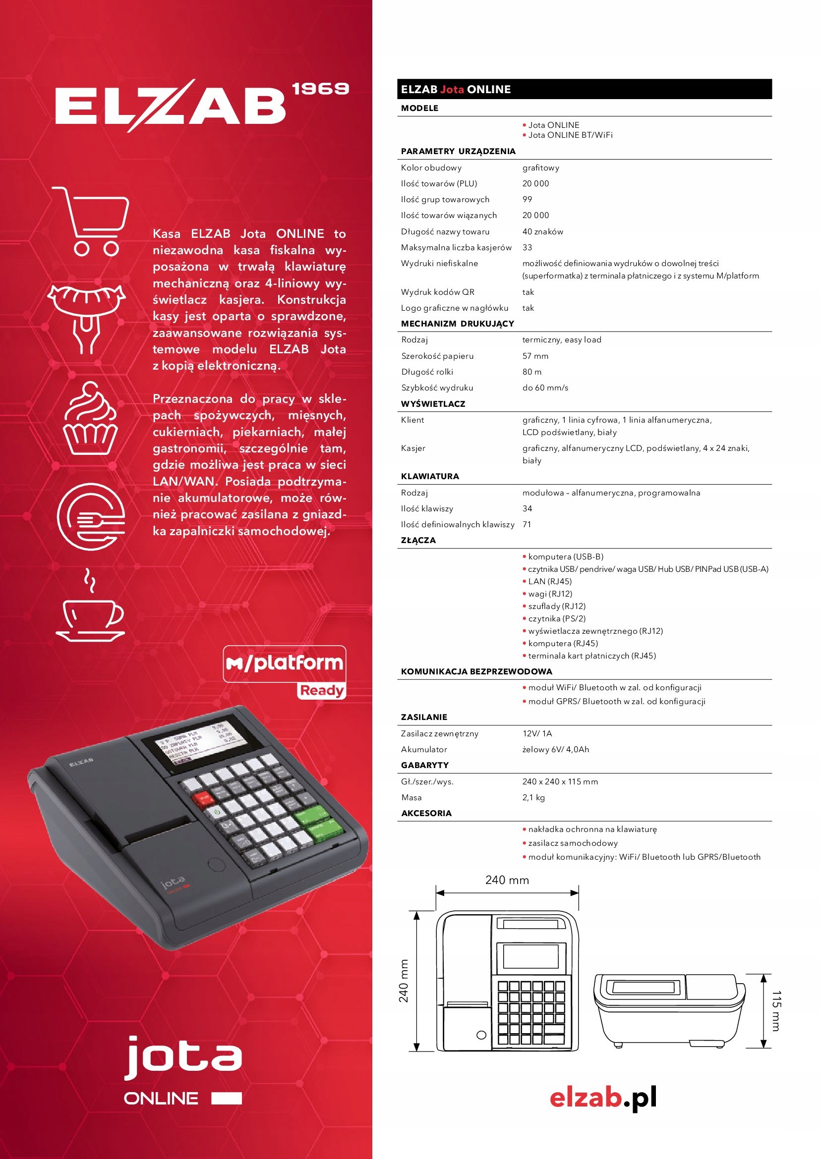 Касса ELZAB Jota ONLINE – это надежный кассовый аппарат, оснащенный прочной механической клавиатурой и 4-строчным кассовым дисплеем. В основе конструкции лежат проверенные передовые системные решения модели ELZAB Jota с электронной копией. Предназначен для использования в продуктовых магазинах, мясных, кондитерских, пекарнях и небольших предприятиях общественного питания, особенно там, где возможна работа в сети LAN/WAN. Имеет резервный аккумулятор, а также может питаться от розетки автомобильного прикуривателя.