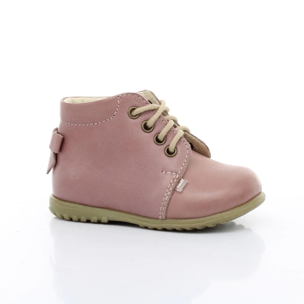 Туфли грязно-розового цвета - идеальны для обучения ходьбе, изготовлены из натуральной кожи высочайшего качества. Обувь достаточно устойчивая и гибкая, внутренняя отделка выполнена из мягкой кожи, защищающей от истирания. Профилированная кожаная стелька - правильно формирует стопу. Застежка регулируется шнурком. Они имеют широкий кончик, который дает свободу пальцам. Гибкая и нескользящая подошва.