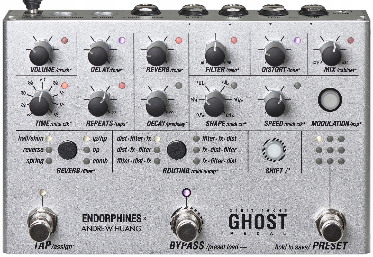 Педали Endorphine.es GHOST — это результат сотрудничества ENDORPHIN.ES и ЭНДРЮ ХУАНЖА, которые, основываясь на своих современных методах создания музыки, разработали креативный звуковой процессор с множеством блоков. Эта версия эффекта педали для гитаристов и клавишников со стереовходами.