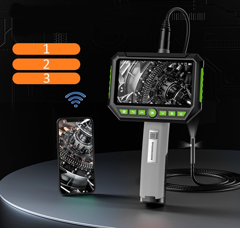 - Эндоскоп оснащен дополнительной камерой HD, установленной сбоку от основной камеры, которая помогает обнаруживать стороны трубы и захватывать больше деталей.