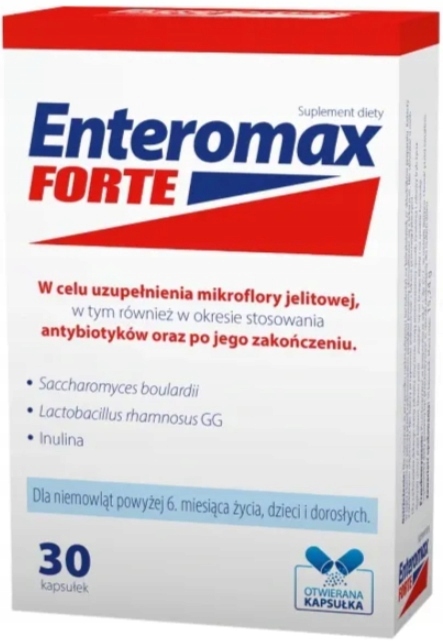 Enteromax Forte Product - пищевая добавка в форме 30 открытых капсул, содержащих 2 штамма: бактерии, дрожжи и инулин. Он предназначен для детей в возрасте 6 месяцев, подростков и взрослых.