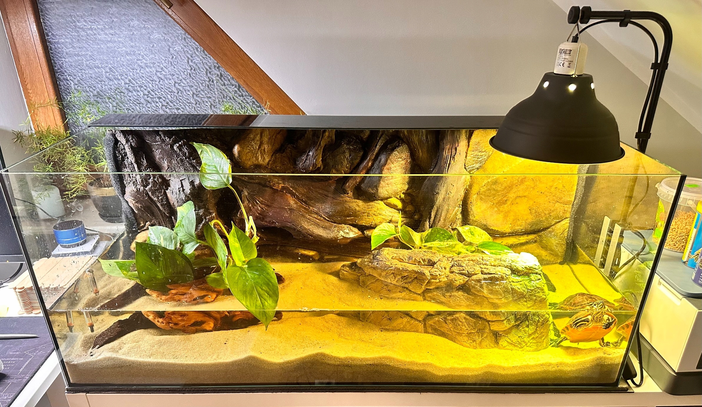 Идеально подходит для акватеррариумов с черепахами-земноводными (пример на фото), а также для тропических террариумов с древесными ящерицами, например, Хамелеоном или Фелсумой. В акватеррариумах стоит охранять растение, чтобы его не съели черепахи. Чтобы растение не загнило, листья должны расти за пределами уровня грунтовых вод. В тропических террариумах стоит использовать опоры для ветвей, чтобы растение могло карабкаться. В этих случаях мы рекомендуем использовать люминесцентные лампы с UVA-излучением или светодиодные UVA-лампы, которые окажут положительное влияние на фотосинтез растений, а также на состояние животных, обитающих в аквариуме.