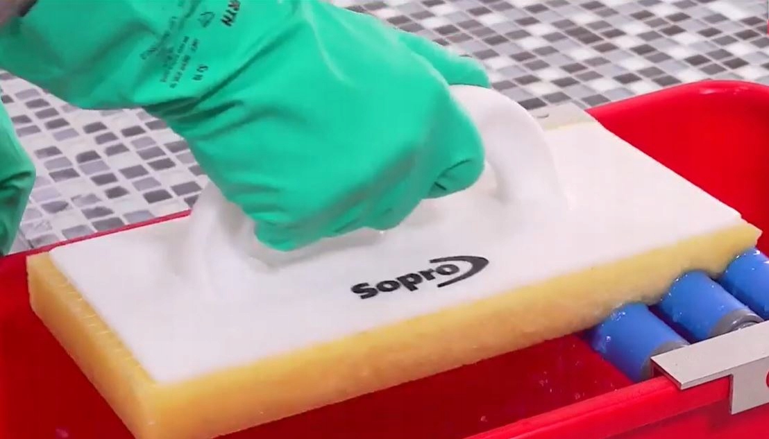 - Через короткое время удалить излишки материала, остатки раствора развести по всей поверхности с помощью влажной полиэфирной губки (белый пад), вискозной губки или шпателя Sopro 076, который следует промыть в ведре с чистой водой, а затем промыть все по диагонали к сетке швов.