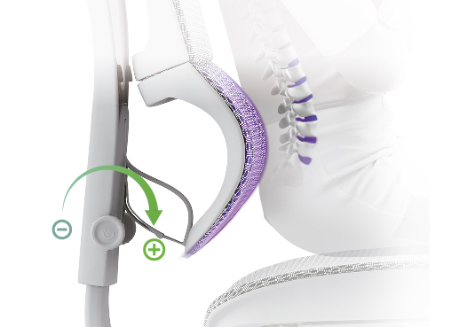 Кресло также оснащено независимым гибким поясничным профилем, который повторяет движения пользователя. Натяжение и сопротивление профиля можно регулировать с помощью ручки на задней части спинки.