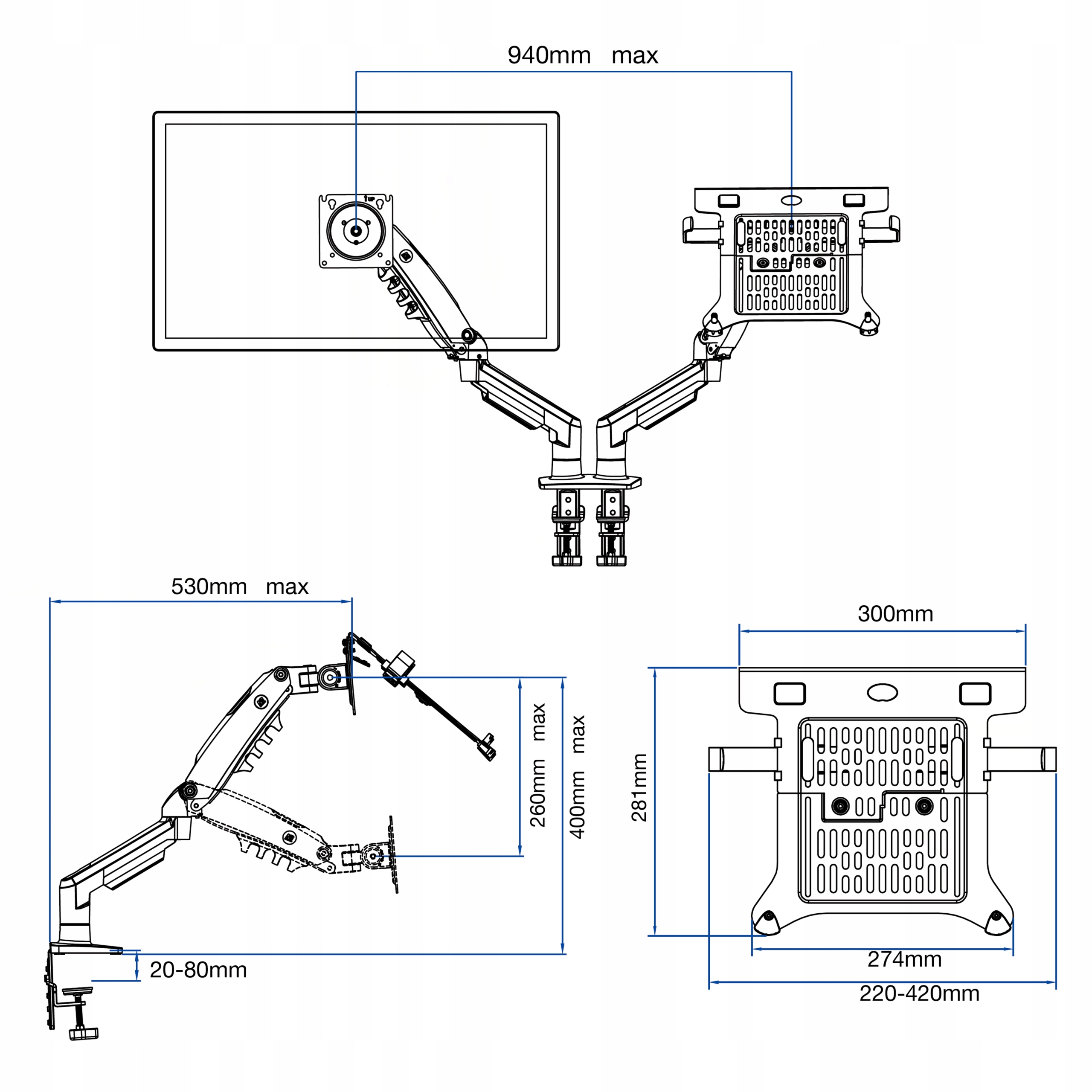 - ✅ Наклон: -30 °/85 ° Максимальный рука Регулировка высоты: 140-400 мм