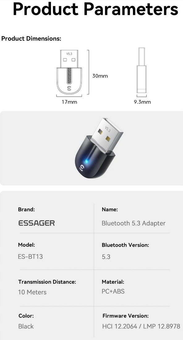 essber usb bluetooth 5.3 Адаптер 5.3 5.3 Адаптер 5.3 Адаптер 5.3 Адаптер 1sty (первоначально упакованный производителем).