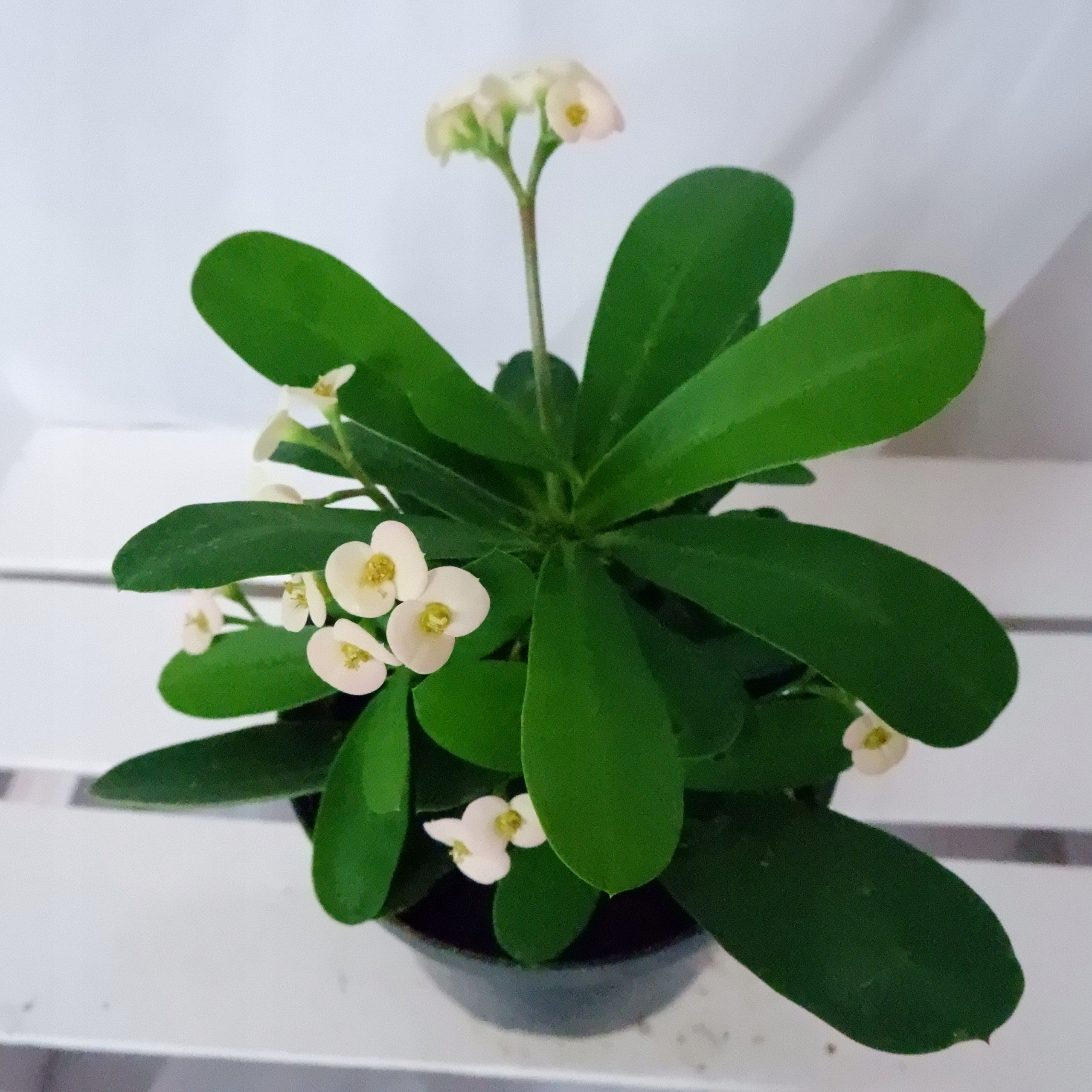 Молочай родом из Мадагаскара (субтропический климат). Форма кустистая, побеги покрыты острыми шипами. Зеленые яйцевидные листья длиной до 7 см. Цветки невзрачные, кроме собственно цветков, на длинных цветоножках растут красивые листья, которые являются настоящим украшением растения.