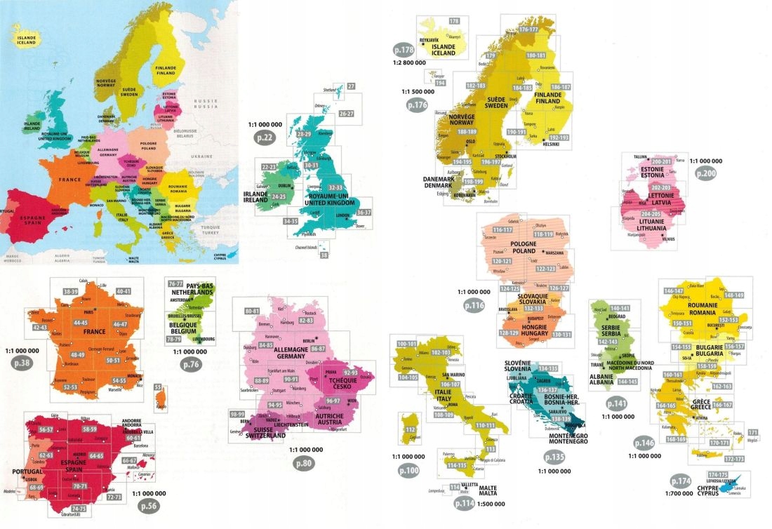 - основная часть, содержащая карты европейских стран в масштабе 1:1 000 000 (кроме Кипра в масштабе 1:700 000, Норвегии, Швеции, Финляндии и Дании в масштабе 1:1 500 000, Исландия в масштабе 1:2 800 000, Мальта в масштабе 1:500 000),