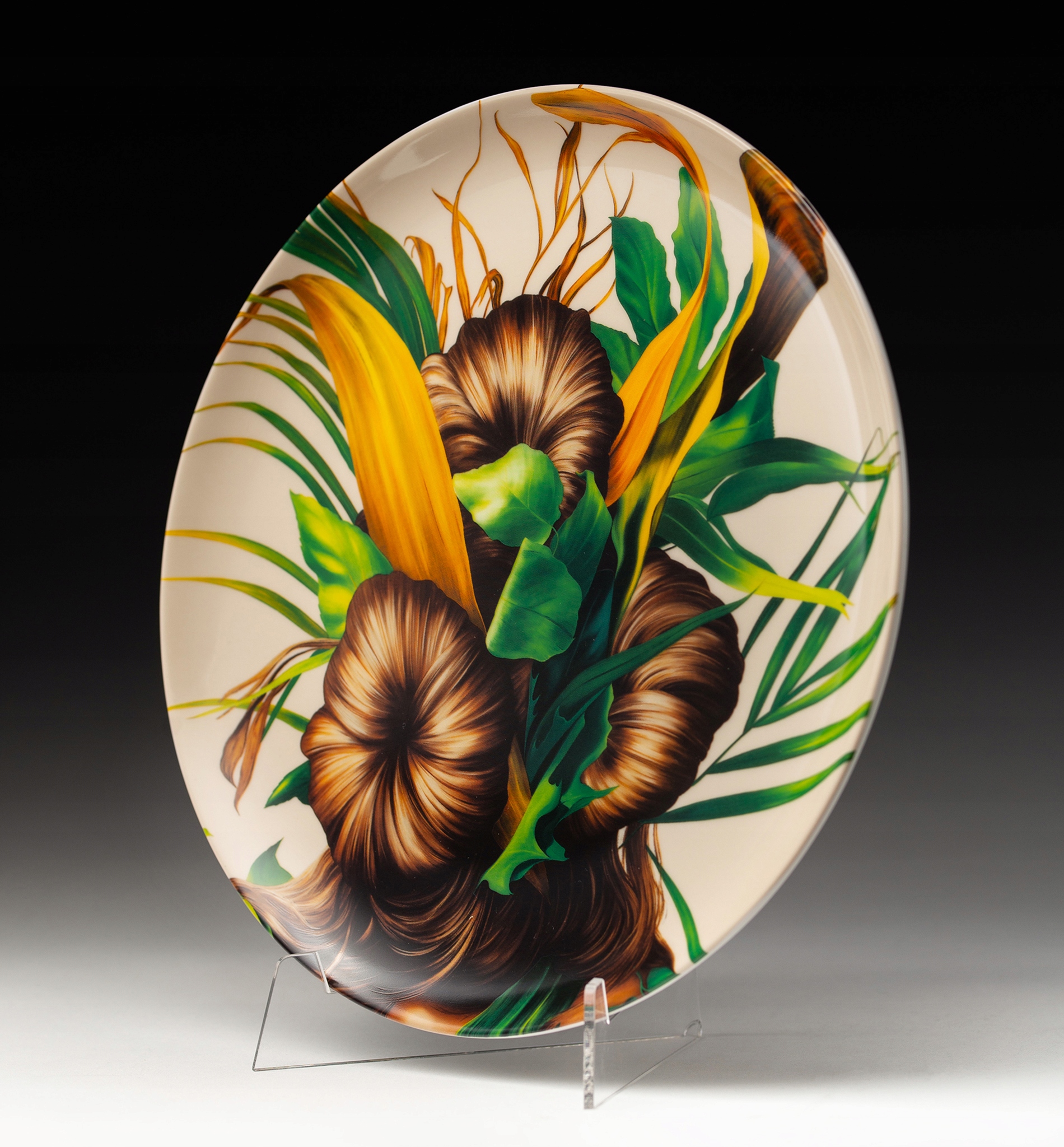 Уникальный объект — фарфоровая тарелка с работой одной из самых узнаваемых и рекордсменок современного художника на арт-рынке — Евы Юшкевич. Ее работы отсылают к старым портретам, но в то же время в извращенной форме комментируют стереотипы о женщинах. Юшкевич вдохновляется классическими изображениями XVIII и XIX веков, но пишет их заново, радикально преобразовывая образы. Вместо лиц у нее каскады волос, драпировки и композиции из перьев, экзотических растений, грибов и насекомых. Художница создает фантастические, безликие портреты, являющиеся альтернативой историческим декорациям и обычаям – и в то же время выстраивает новую, женственную перспективу в истории искусства.