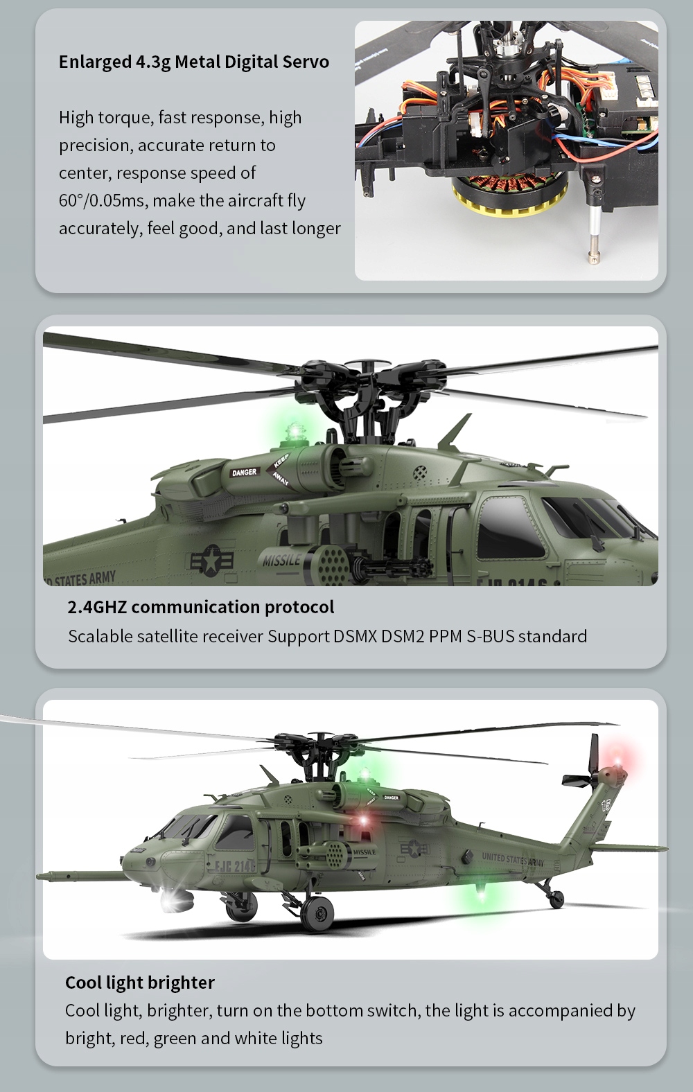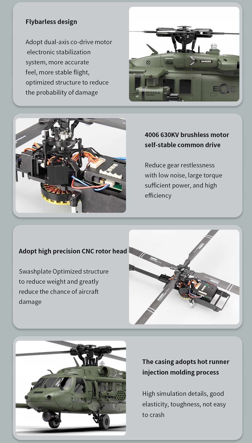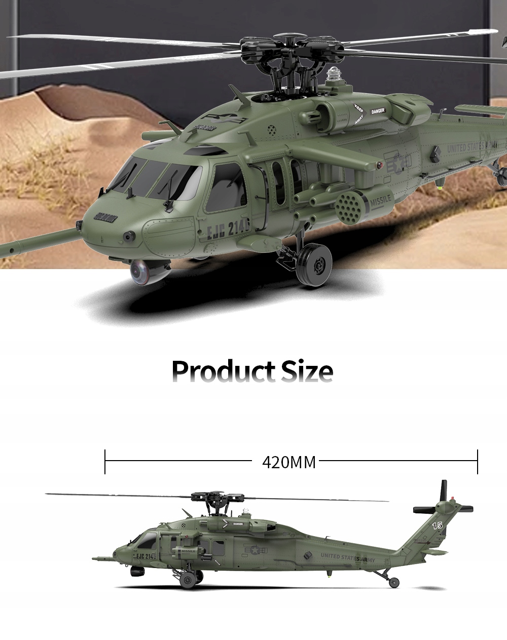 1> он масштабируется в соответствии с соотношением 47: 1 вертолета UH60-черно-черного ястреба, с деталями апперации с высоким содержанием симуляции, прохладными огнями, левыми и правыми боковыми дверями, а также с помощью штока-аборби-шарика. Работа, расширенные боеприпасы, ракетные пусковые установки, ракеты, воздушные орудия гатлинга, воздушные заправки и т. Д. Торговый ротор принимает высокоэффективный четырехлетный винт, который является более эффективным, покроем и более реалистичным.