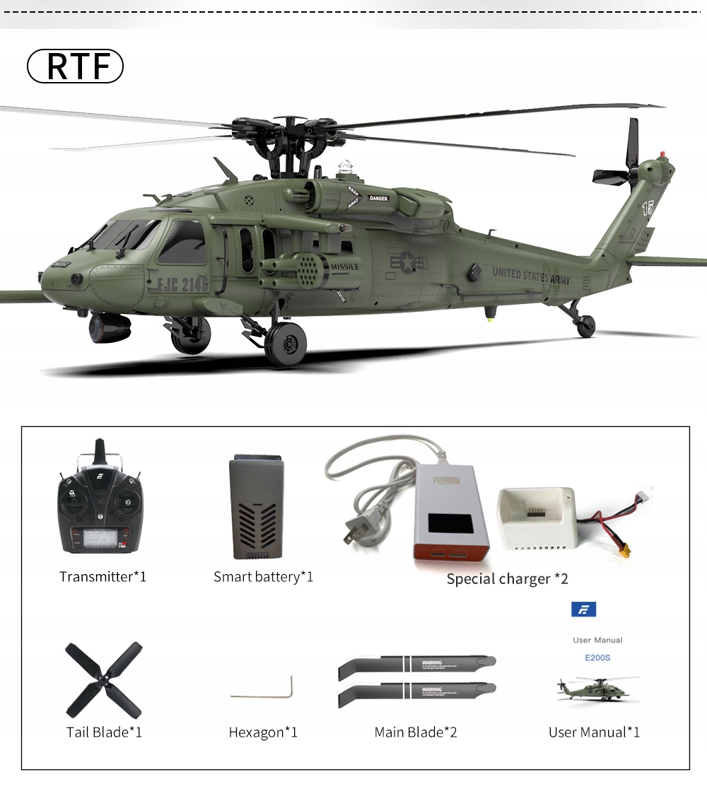 rtf: 1 X E200S RC Helicopter 1 x передатчик 1 x usb -зарядное устройство 1 x батарея 1 х хвостовой лезвие 4 x основные лезвия 1 x Руководство пользователя