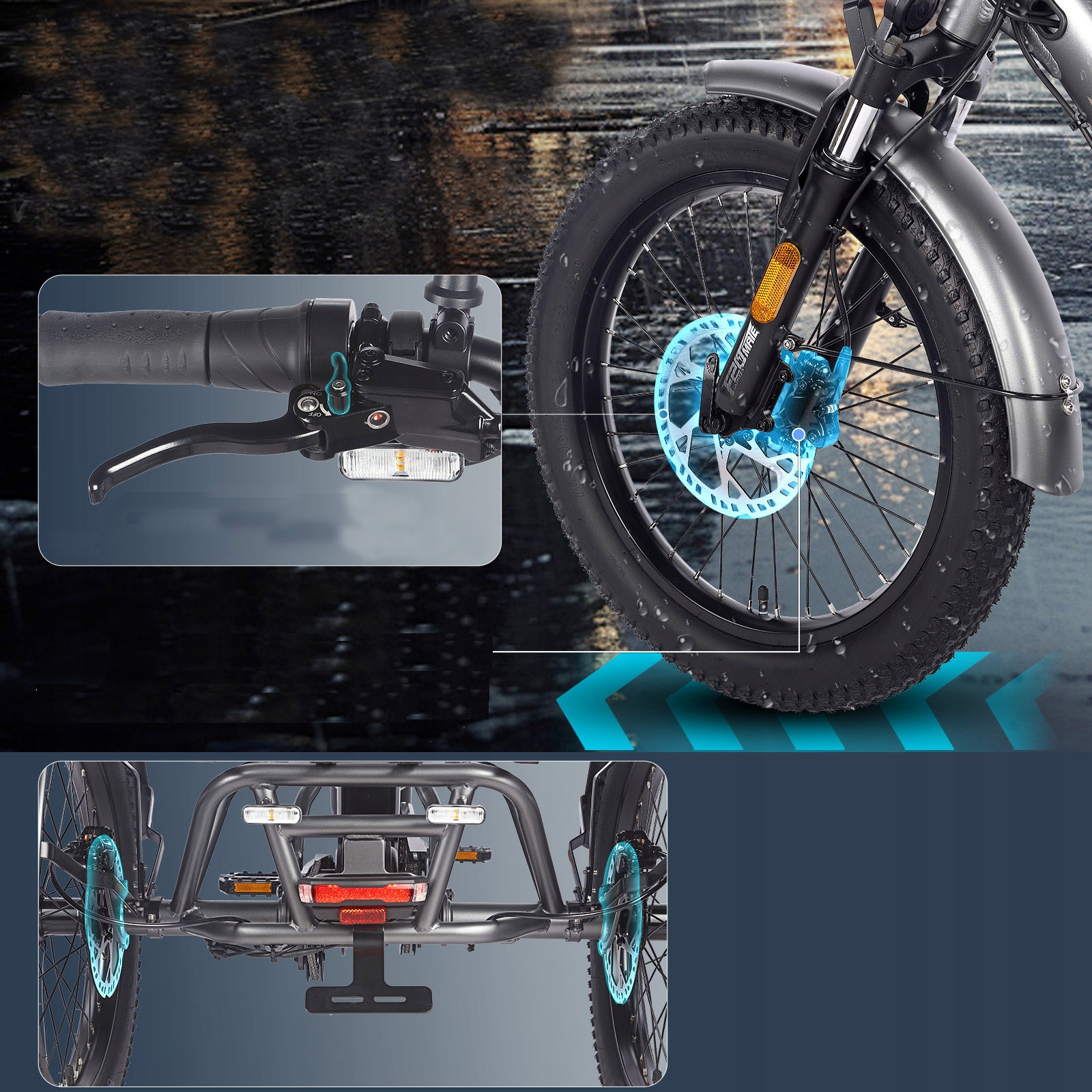 F20 Mate оснащен тройной тормозной системой премиум-класса, сочетающей гидравлические дисковые тормоза на двух передних и задних колесах с независимыми рычагами стояночного тормоза. Эта усовершенствованная конфигурация обеспечивает сокращение тормозного пути на 30 %, плавное торможение и надежную работу в любых погодных условиях – даже при тяжелых нагрузках. Рычаг стояночного тормоза блокирует трехколесный велосипед, когда он не движется, предотвращая его скатывание.