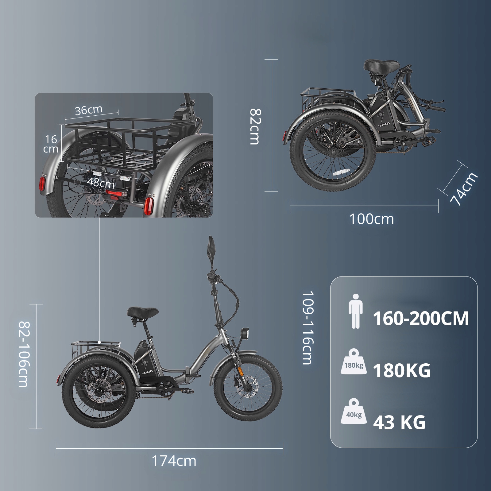на перевозку до 180 кг, в том числе 20 кг спереди и 45 кг сзади - идеально подходит для перевозки грузов, продуктов или расходных материалов.