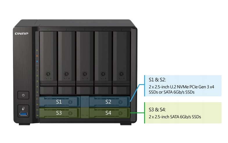 TS-h973AX поставляется с четырьмя 2,5-дюймовыми слотами для твердотельных накопителей — слоты 1 и 2 с поддержкой для высокопроизводительных твердотельных накопителей U.2 NVMe PCIe Gen 3 x4 или экономичных твердотельных накопителей SATA 6 Гбит/с. Для приложений, подверженных задержкам, твердотельные накопители U.2 NVMe PCIe Gen 3 x4 обеспечивают пропускную способность до 32 Гбит/с для оптимальной производительности и эффективности. Вы также можете использовать адаптер QDA-UMP от QNAP для замены твердотельных накопителей U.2 NVMe на экономичные твердотельные накопители M.2 NVMe Gen 3 x4 для поддержания высокого уровня производительности при дальнейшем сокращении затрат.