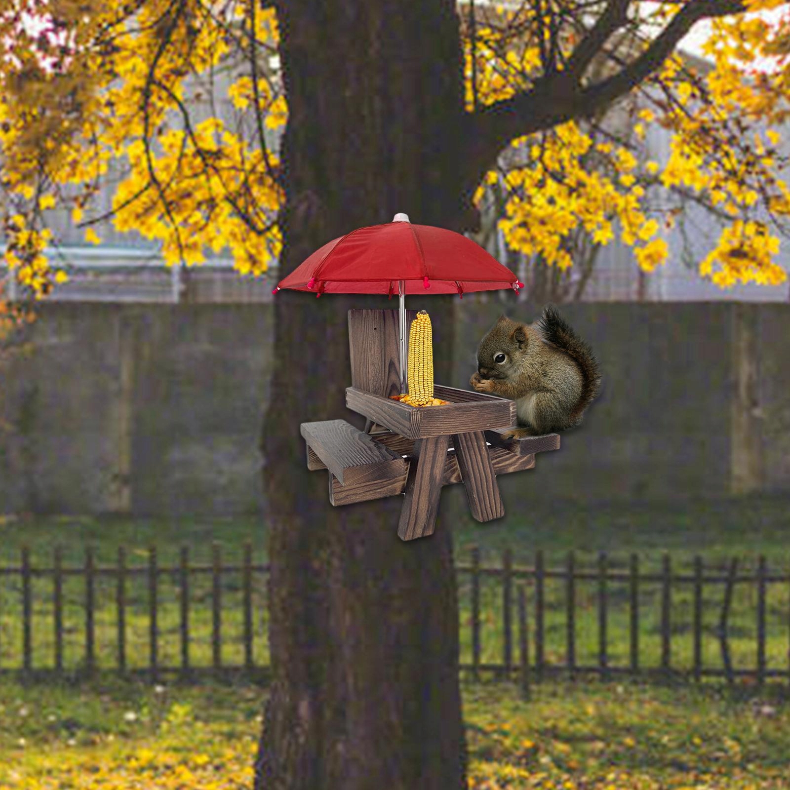Оборудован скамейками для белок с обеих сторон и кресло -креслом, а сиденье достаточно велики, чтобы разместить двух белок, которые едят одновременно.