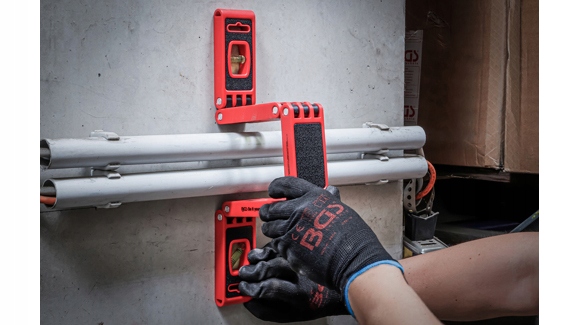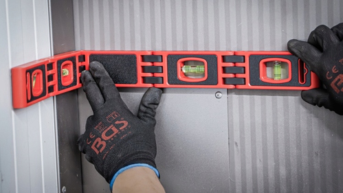 Гибкий ватерпас с 4 шарнирами и 4 уровнями (горизонтальный, отвесный, 45°) идеально подходит для мест, где традиционные ватерпасы не работают. Благодаря своей конструкции он легко обходит препятствия, такие как кабели, розетки или трубы, обеспечивая точное выравнивание даже при установке угловых полок. Гибкость уровня позволяет идеально приспособиться к неровностям, краям и изгибам. Прочный материал гарантирует стабильность размеров. Уровень компактен, легко помещается в сумку для инструментов и имеет два отверстия на концах для подвешивания в мастерской.