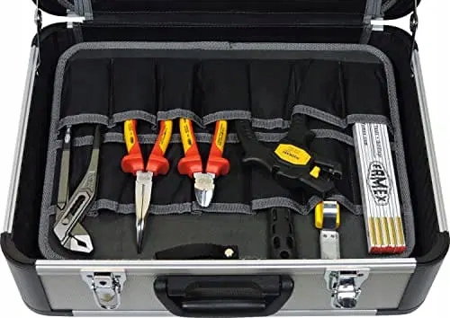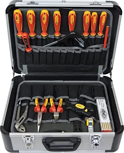 • Многие инструменты немецкого производства, в том числе: плоскогубцы для шарнирных водяных насосов, 5 отверток VDE, набор плоскогубцев, кусачки, пила, молоток и многое другое!
