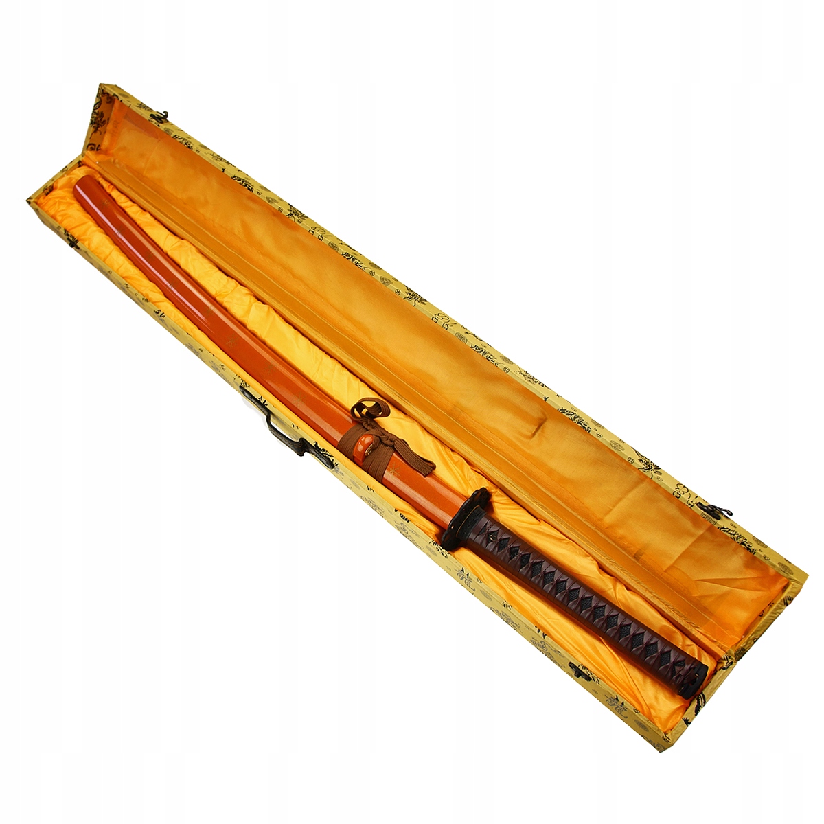 шелковая одежда , бросая всю катану, очевидно для этой драгоценности! Катана упакована в деревянную подарочную коробку, чья поверхность хлопка украшена украшениями