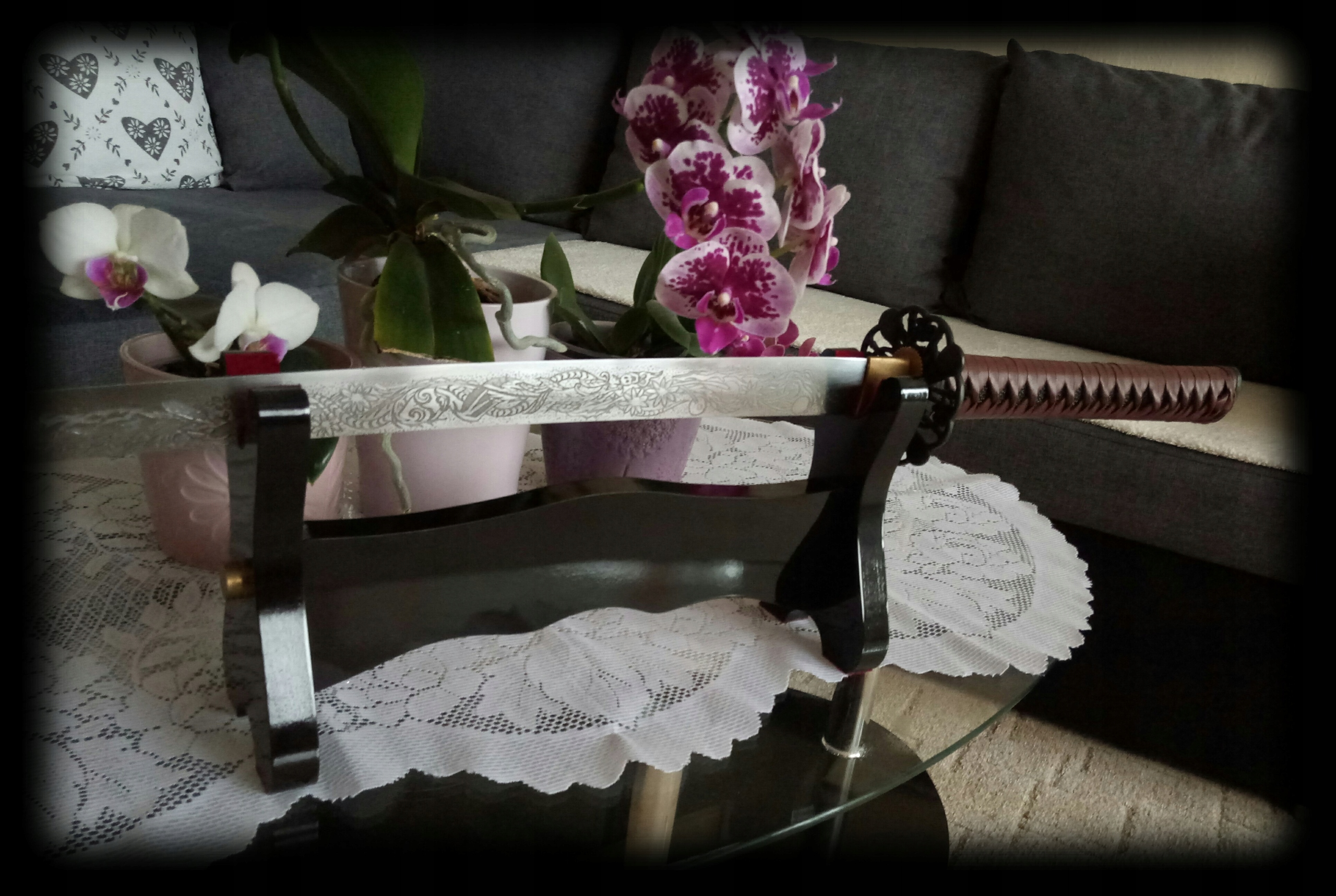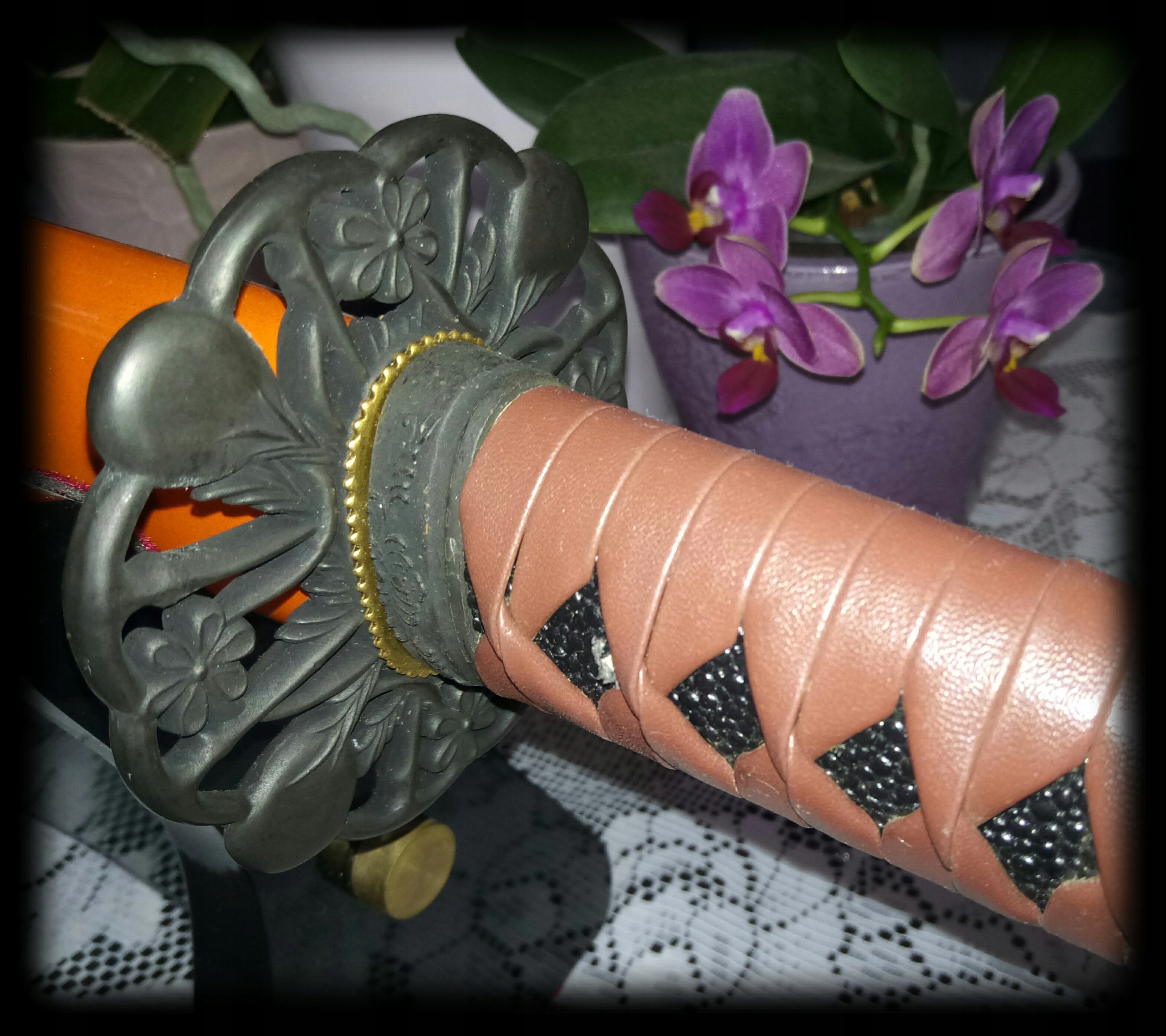 Красота длится в ручке. латунный habaki , декоративная металлическая крышка (tsuba), надежная и очень сильная коса украшения или отделка (кашира). Влагалище для самурайского меча - это, конечно, полностью деревянный, в темно -оранжевом цвете с хлопьями. качество и практичность по отношению к цене больше, чем поразительны!