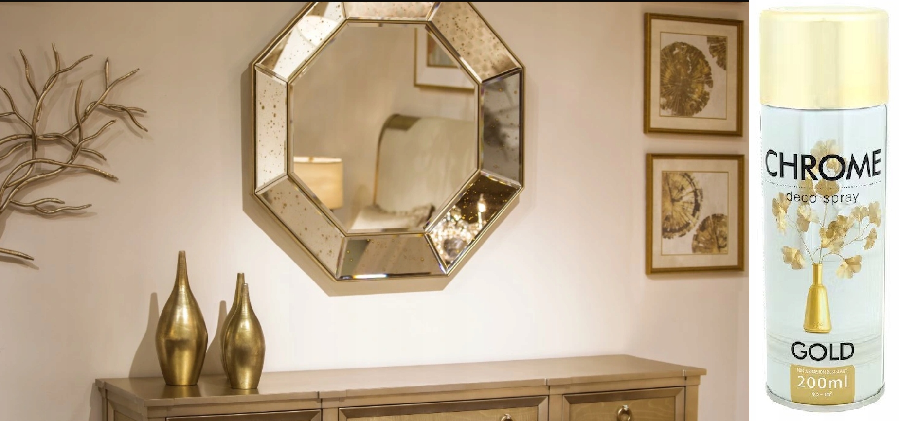 Придайте мебели или предметам декора золотистый цвет с помощью аэрозольной краски с эффектом хрома!