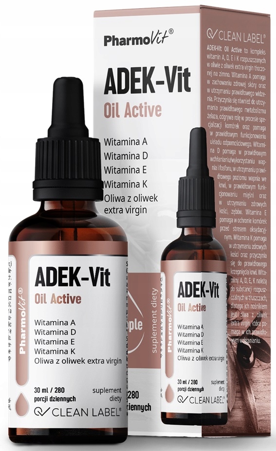 ADEK-Vit Oil Active — это комплекс витаминов A, D, E и K, растворенных в оливковом масле холодного отжима. Витамин А помогает поддерживать здоровье кожи и правильное зрение. Он также способствует поддержанию правильного метаболизма железа, играет роль в процессе специализации клеток и помогает в правильном функционировании иммунной системы. Витамин D, полученный из ланолина, помогает правильному усвоению/использованию кальция и фосфора, поддержанию надлежащего уровня кальция в крови, правильному функционированию мышц и поддержанию здоровья костей и зубов. Витамин Е помогает защитить клетки от окислительного стресса. Витамин К (Mk7) помогает поддерживать здоровье костей и способствует правильному свертыванию крови. Витамины A, D, E, K являются жирорастворимыми веществами, поэтому их носителем является оливковое масло первого холодного отжима, способствующее их правильному усвоению.