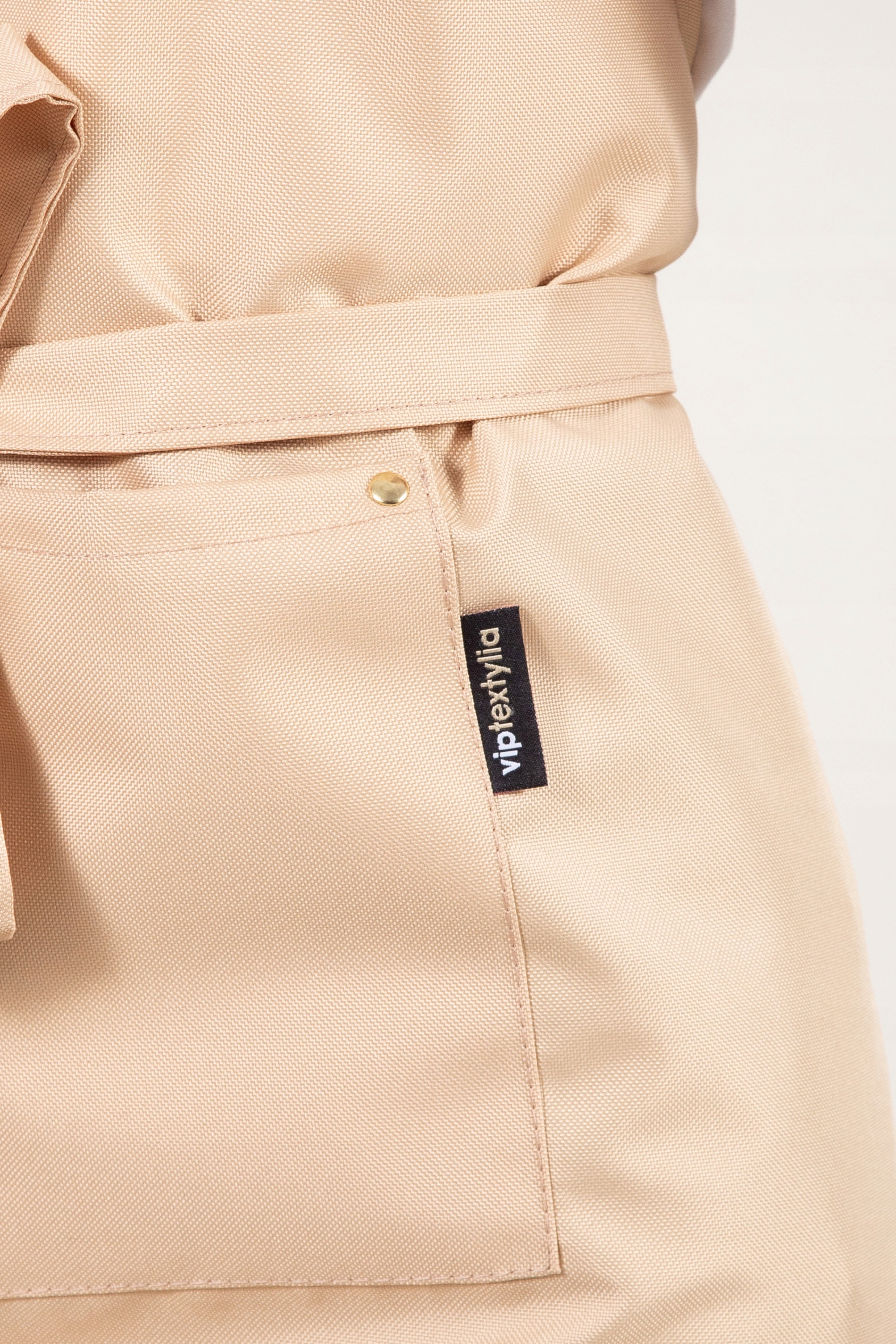 Фартук элегантного современного дизайна идеально подходит к любому типу фигуры благодаря соответствующему Вырезайте и используйте высококачественный материал. Ткань повышенной плотности прочная, легкая и комфортная в носке – вы ее практически не ощущаете во время работы. Материал водонепроницаем, что позволяет легко удалять мелкие загрязнения, но не обладает химической стойкостью, поэтому фартук не пригоден для работы с сильными химическими веществами, например, с парикмахерскими красками. Фартук добротно изготовлен нашей компанией VIPTEXTYLIA. Он оснащен регулируемым шейным ремнем с металлической застежкой-карабином с обеих сторон, что обеспечивает комфорт и элегантный вид. Завязывается спереди или сзади бретелями из той же ткани, отделанными современной металлической фурнитурой. Карман в передней части фартука дополнительно усилен декоративными заклепками, что гарантирует долговечность и стильный вид. Чем выделяется наш фартук?