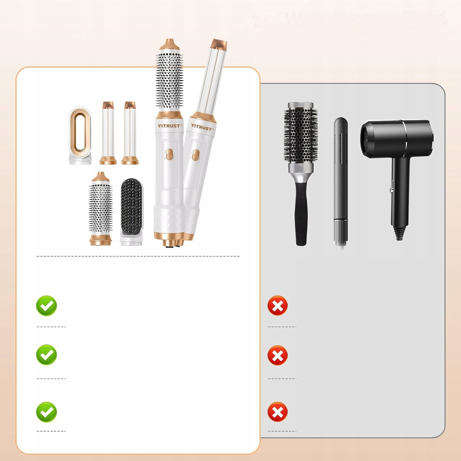 Многофункциональность — наш продукт оснащен 5 сменными насадками, поэтому вы можете создавать кудри, волны, выпрямлять или сушить волосы феном в одном устройстве.