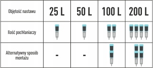 Количество необходимых поглотителей запаха и частота замены угля в фильтре зависит от установленного объема и интенсивности газов, выделяющихся при брожении. Для лучшего эффекта фильтры можно складывать (макс. 2 шт.) в одну трубку или использовать в отдельных трубках (рекомендации по применению указаны в таблице).