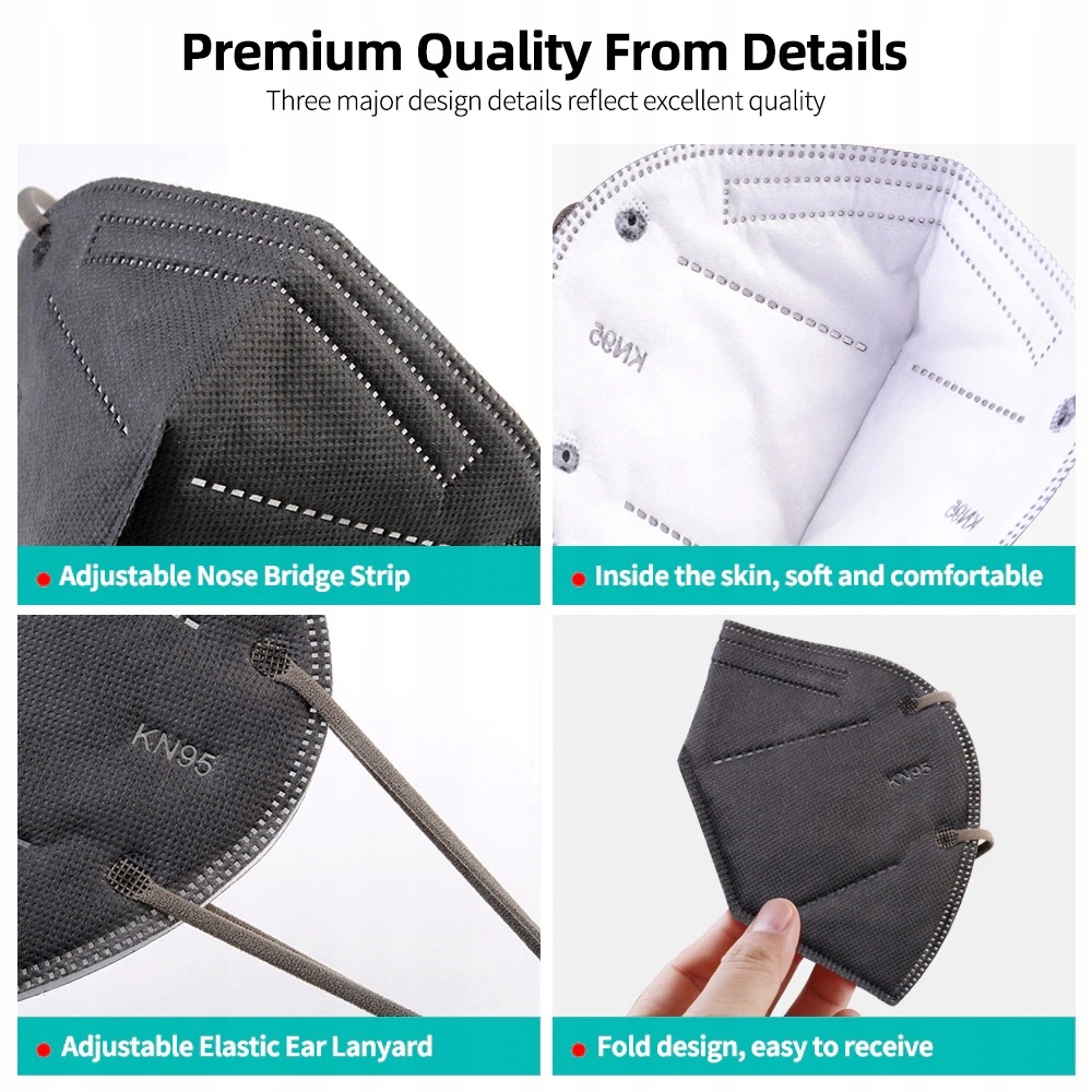 Эти защитные маски для лица типа KN95 (FFP2), называемые также масками против смога, изготовлены из высококачественных 5-ти фильтрующих слоев различной плотности и свойств. Благодаря этому такая полумаска фильтрует до 95% частиц размером 0,075 мкм, т.е. не только не пропускает носители бактерии, вирусы, аллергены, биологические жидкости, а также газы, дымы и химические вещества и пыль, образующиеся во время строительных, лесных и промышленных работ. Защитная маска для лица типа ffp2 обеспечивает высокую защиту наших легких и дыхательной системы от вредных веществ. При этом он комфортен даже после многих часов использования, обеспечивая свободу дыханию и не раздражая кожу лица.