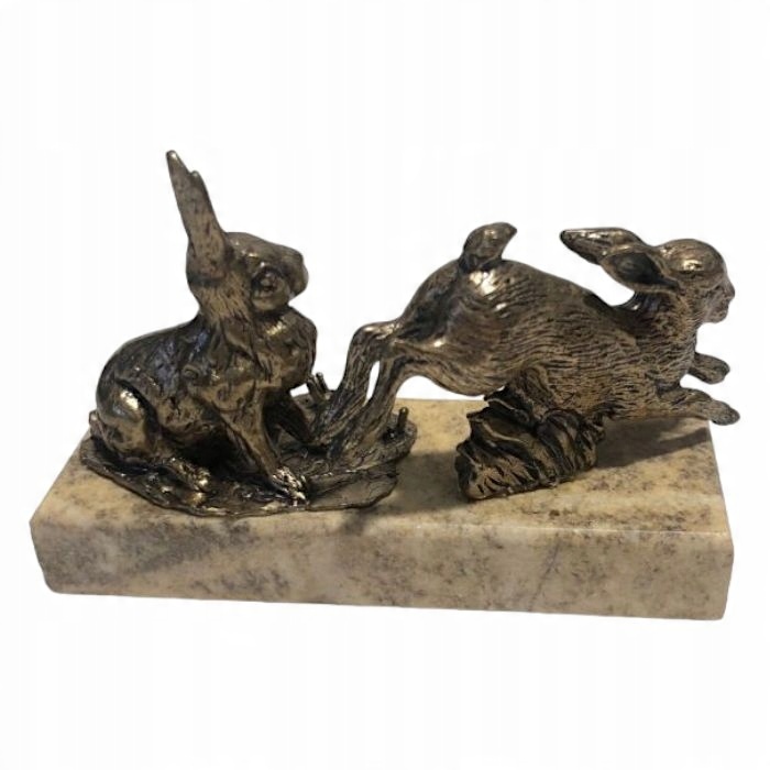 Приглашаем вас открыть для себя элегантность и очарование этой очаровательной скульптуры двух кроликов, выполненной из бронзы и установленной на подставке из песочного мрамора.