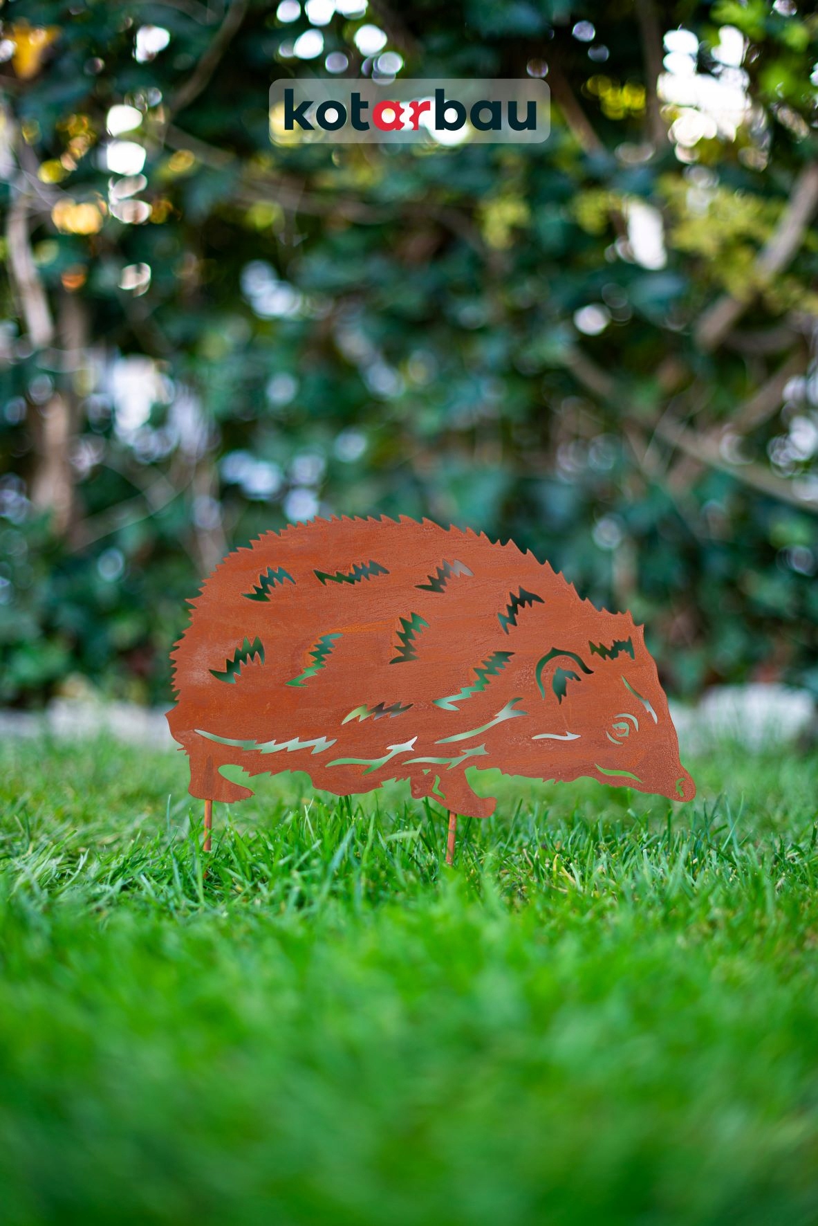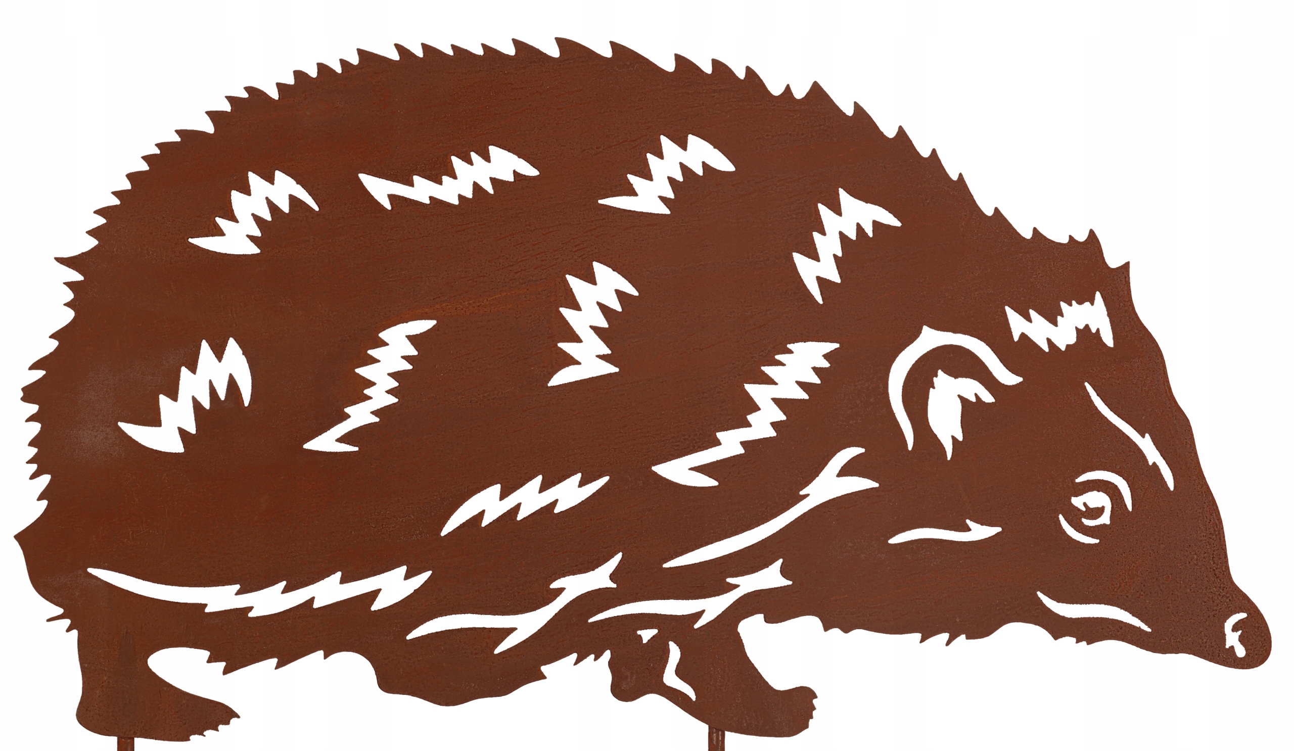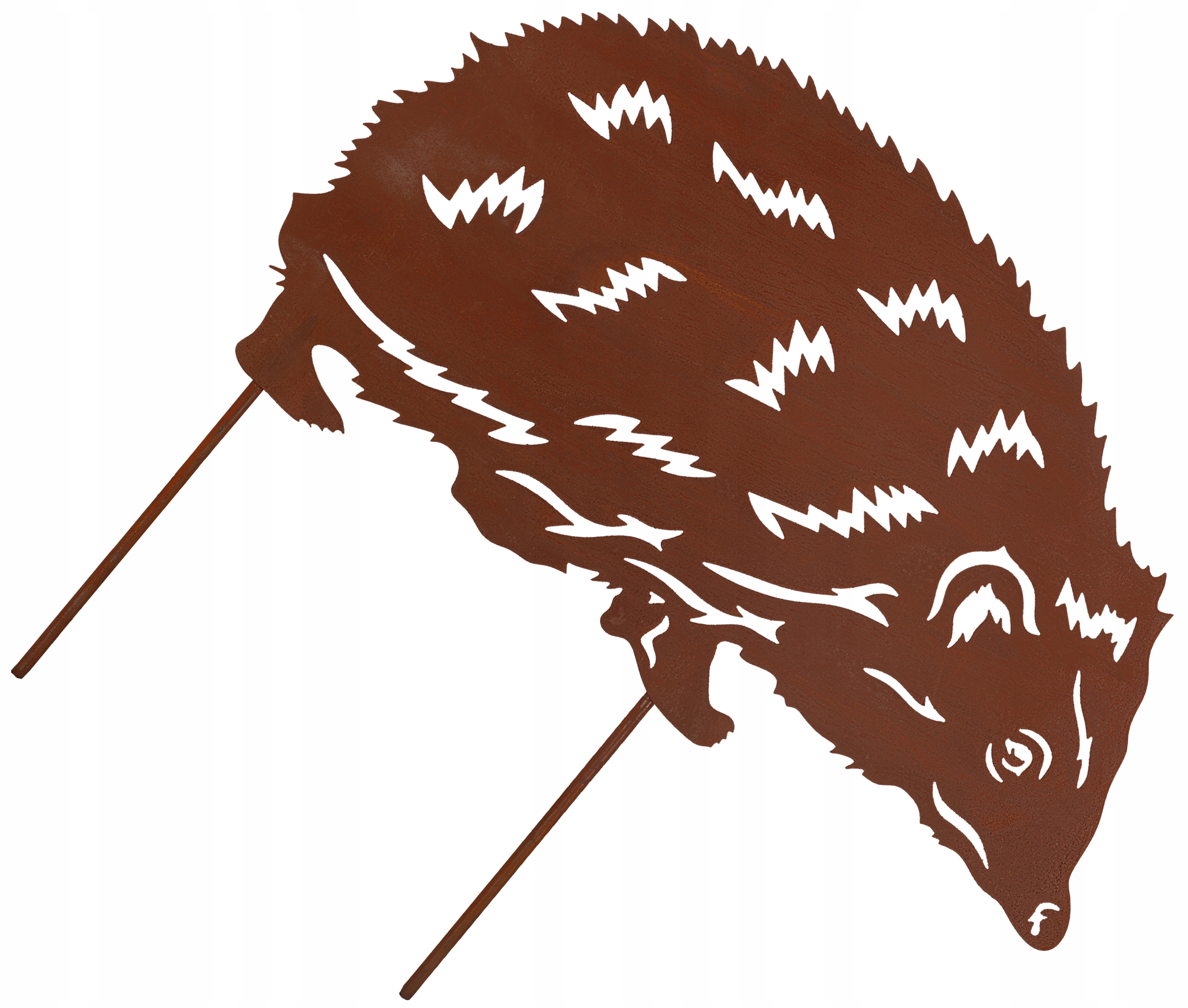 - Еж, выполненный из листового металла на стержне, изготовлен из листового металла РОСТ, что придает ему слегка ржавый цвет.