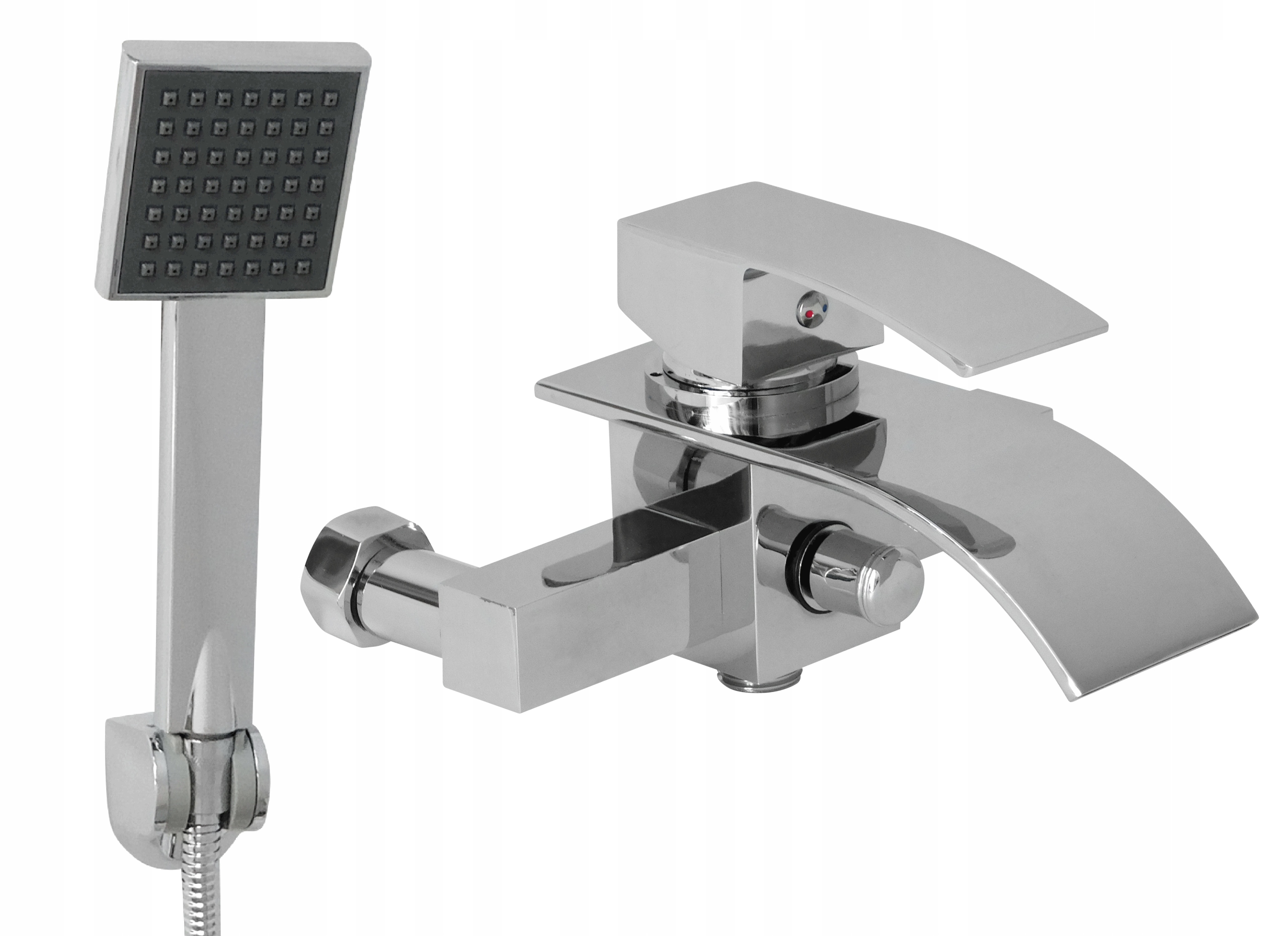 Каскадный смеситель для ванны хромированный с душем, шлангом и ручкой