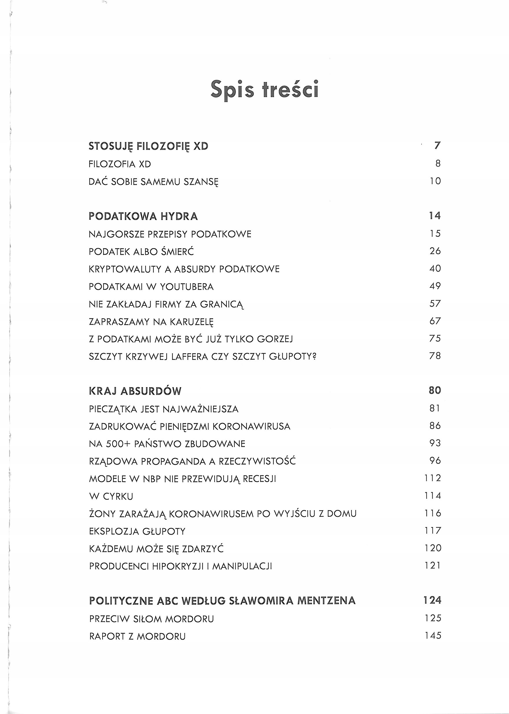 Книга подготовлена на основе многочисленных лекций доктора . Ментцена, интервью, проведенные с ним и размещенные в основном на каналах VETO MEDIA, namzależy.pl и wRealu24, а также дополненные размышлениями, которыми доктор Ментцен делится на своем профиле в Facebook. Этих онлайн-высказываний Славомира Ментцена так много, что мы понимаем, что порой сложно осилить сотни часов материалов, размещенных в Интернете, поэтому мы решили встретиться со всеми сторонниками доктора Ментцена. Ментцен и все те, кто ищет голос разума в этой зачастую абсурдной польской реальности, представляют подборку его наиболее интересных и точных наблюдений, в частности, о польской налоговой системе, политике и отдельных скандалах, которые в той или иной степени шокировали Польская политическая сцена."