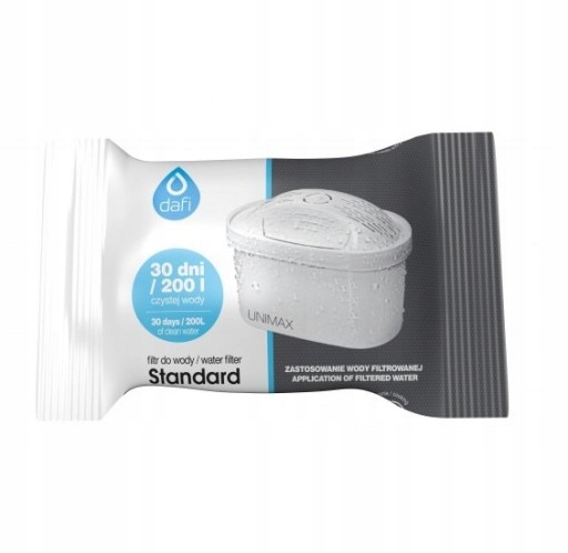 Фильтр «Стандартный унимакс» предназначен для улучшить качество водопроводной воды. Это делает его идеальным для питья, пивоварения и приготовления пищи. Фильтрованная вода Dafi Standard является альтернативой бутилированной воде. Кроме того, он предотвращает накопление осадка на нагревательных элементах чайника, утюга и кофемашины.