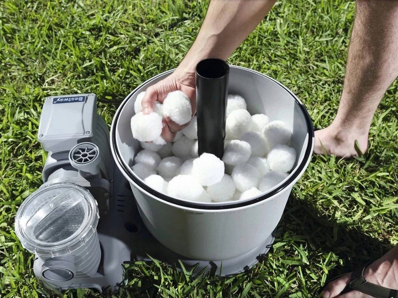 - Замените традиционный песок в фильтре для бассейна фильтрующими шариками, следя за тем, чтобы количество шариков соответствовало характеристикам вашей системы фильтрации.