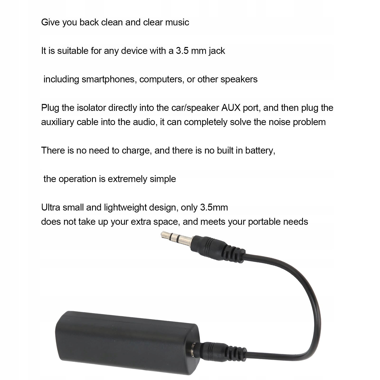4. Подключите изолятор непосредственно к порту AUX вашего автомобиля/динамика, затем подключите вспомогательный кабель к аудио, это может полностью решить проблему шума.