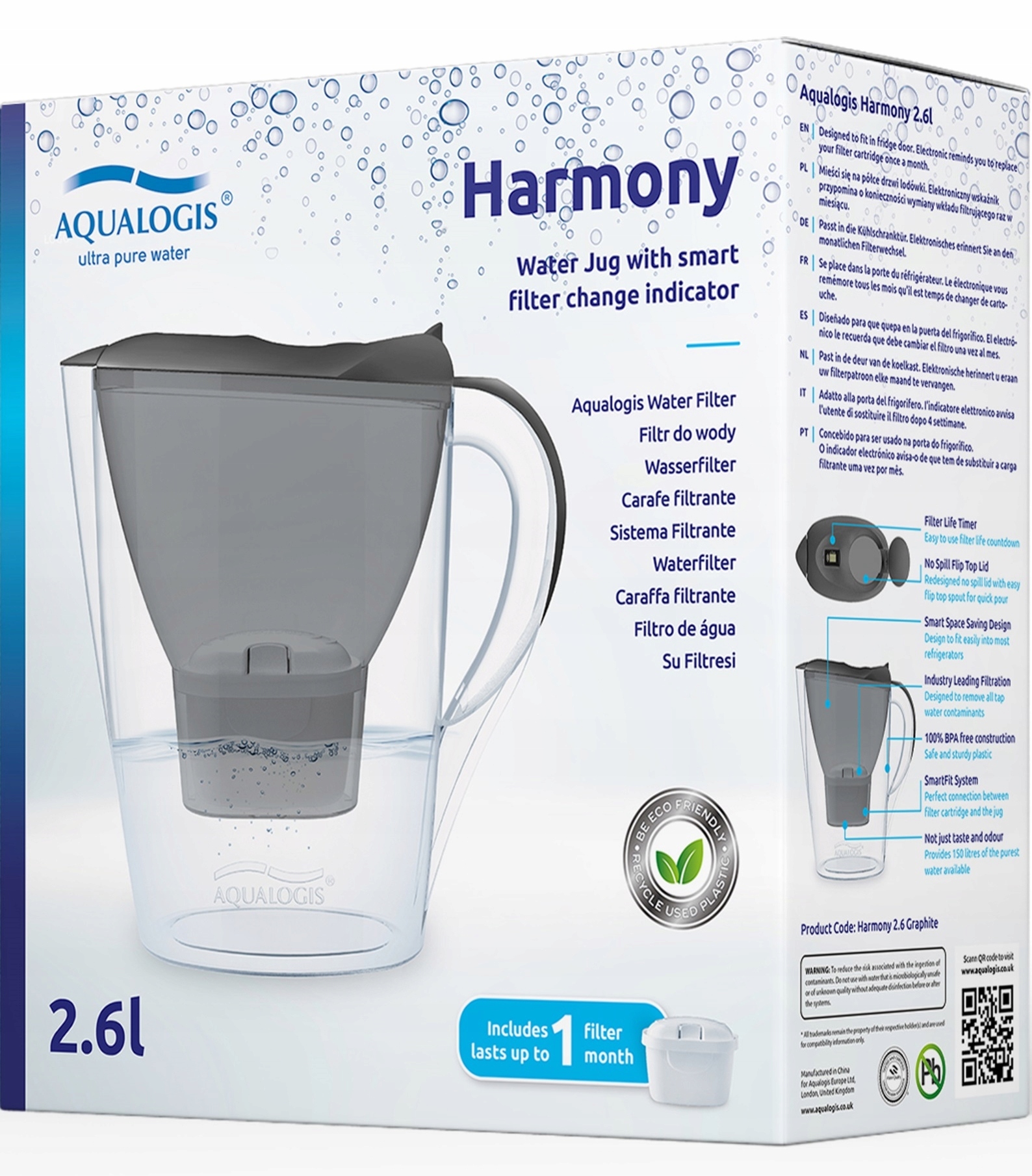 - Используя фильтр-кувшин Aqualogis Harmony, вы используете только один сменный фильтр в месяц вместо нескольких «упаковки» воды в пластиковые бутылки, тем самым заботясь об окружающей среде, сокращая отходы ПЭТ.