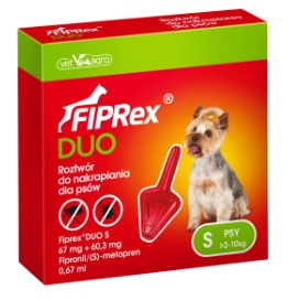 fiprex duo-это линия лекарственных средств, предназначенная для борьбы с блохими и клещами у собак, кошек и крышек. Duo Fiprex содержит два активных вещества в композиции: Fipronil и (s) -Metoprene. Действие подготовки состоит в том, чтобы устранение блох, клещей и людей, блокируя нервную проводимость паразита, и, как следствие, его паралич и смерть. Фипрониль борется с блохами в течение 24 часов, а также в течение 48 часов с момента использования. Содержится в продукте Fiprex Duo, (S) - Metoprene - ингибирует развитие незрелых фигур блох (яйца, личинок и куколок), которые встречаются в среде существования животных, мин. в ручках и логове. Инсектицидный эффект против новых взрослых инвастеров сохраняется в течение 8 недель.