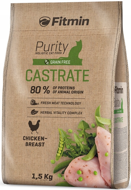 Кулинарный праздник для вашей кошки. Корм Fitmin Cat Purity Castrate. Вы найдете свежее куриное мясо, травы, поддерживающие жизненные силы организма, фрукты и овощи. Вы не только порадуете своего кота, но и накормите его первоклассным кормом. Fitmin Cat Purity Castrate – это так называемый беззерновые продукты, что означает, что они не содержат глютена и снижают потенциальный риск аллергических реакций (например, на пшеничный и кукурузный глютен). Уникальный состав делает его идеальным для стерилизованных кошек. Благодаря этому кот будет в отличной форме. Более того, пища выполняет важную детоксикационную функцию благодаря травяной смеси, обладающей множеством других полезных свойств. Питание производится по новейшим технологиям, сбалансировано, содержит большое количество ингредиентов животного происхождения и других полезных для здоровья компонентов, особенно стоматологический комплекс, пребиотики, хелаты и многие другие.