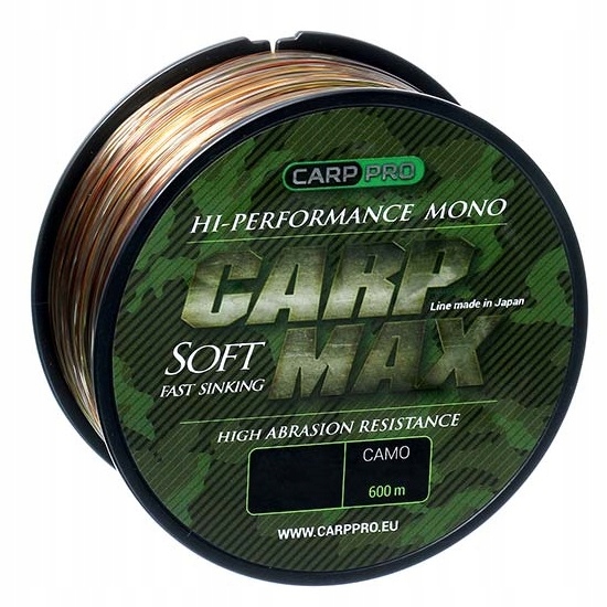 Технологически продвинутая монофиламентная рыбалка с монофиламентами со специальными нейлоновыми добавками, которые дополнительно укрепляют узлы. Нейлон также позволяет вам продлить срок службы и хранения вен. Максимальное расстояние литья достигается благодаря полимерной оболочке внешнего слоя. Линия Carp Pro Carp Max производится в Японии и предназначена для рыбалки в трудных местах. Он надежно при крайних нагрузках, имеет высокую сопротивление истирания, низкое удлинение и низкий коэффициент памяти. Цвет камуфляжа линии рыбалки (камуфляж) идеально маскирует ее в полюсе с водой, сочетается с подводной флорой и почвой