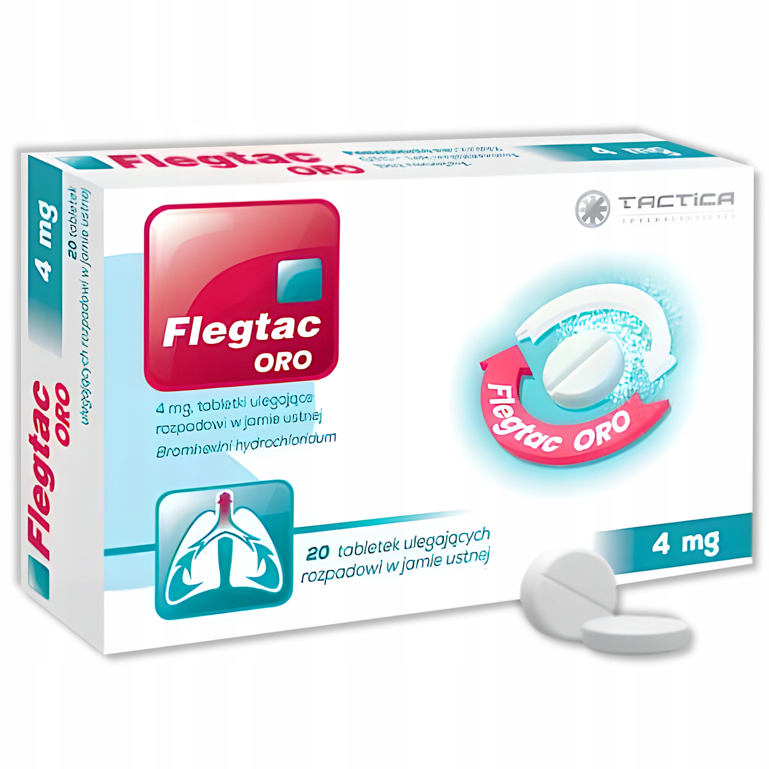 Активное вещество Flegtac Oro 4 мг содержит бромгексина гидрохлорид. Бромгексин разжижает выделения из дыхательных путей, действуя таким образом как отхаркивающее средство. Кроме того, он облегчает отхаркивание и облегчает кашель. Лекарство выпускается в форме таблеток, распадающихся перорально. Препарат показан для лечения острых и хронических заболеваний органов дыхания, сопровождающихся нарушением отхаркивания и отделения слизи.
