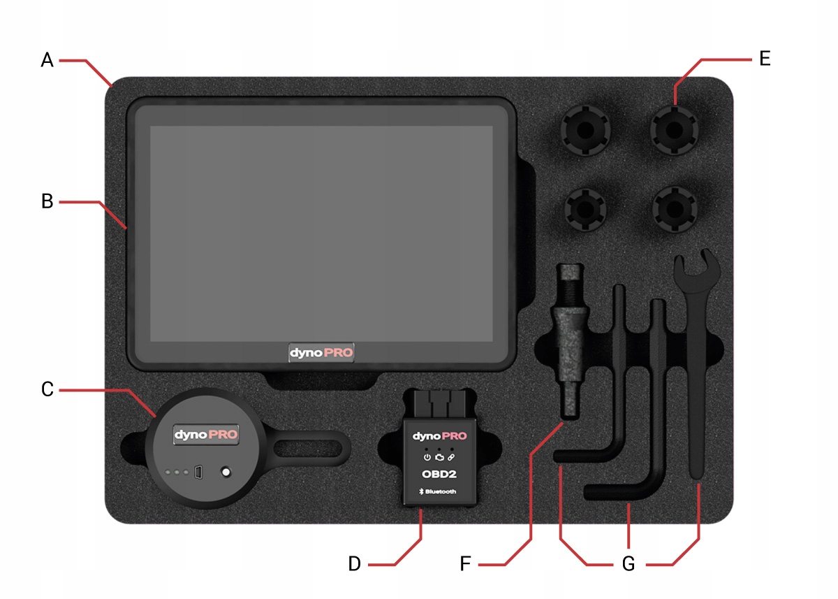 B – Планшет (с приложением DynoPRO) в защитном чехле, зарядное устройство