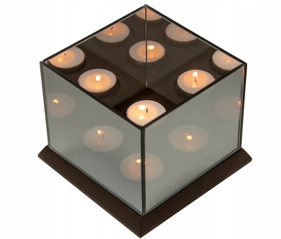 Внутренняя часть куба покрыта зеркалами, расположенными под углом 90 градусов. В результате, когда вы помещаете несколько чайных свечей в подсвечник, создается впечатление, что горят сотни огней. Это дает поистине потрясающий эффект.