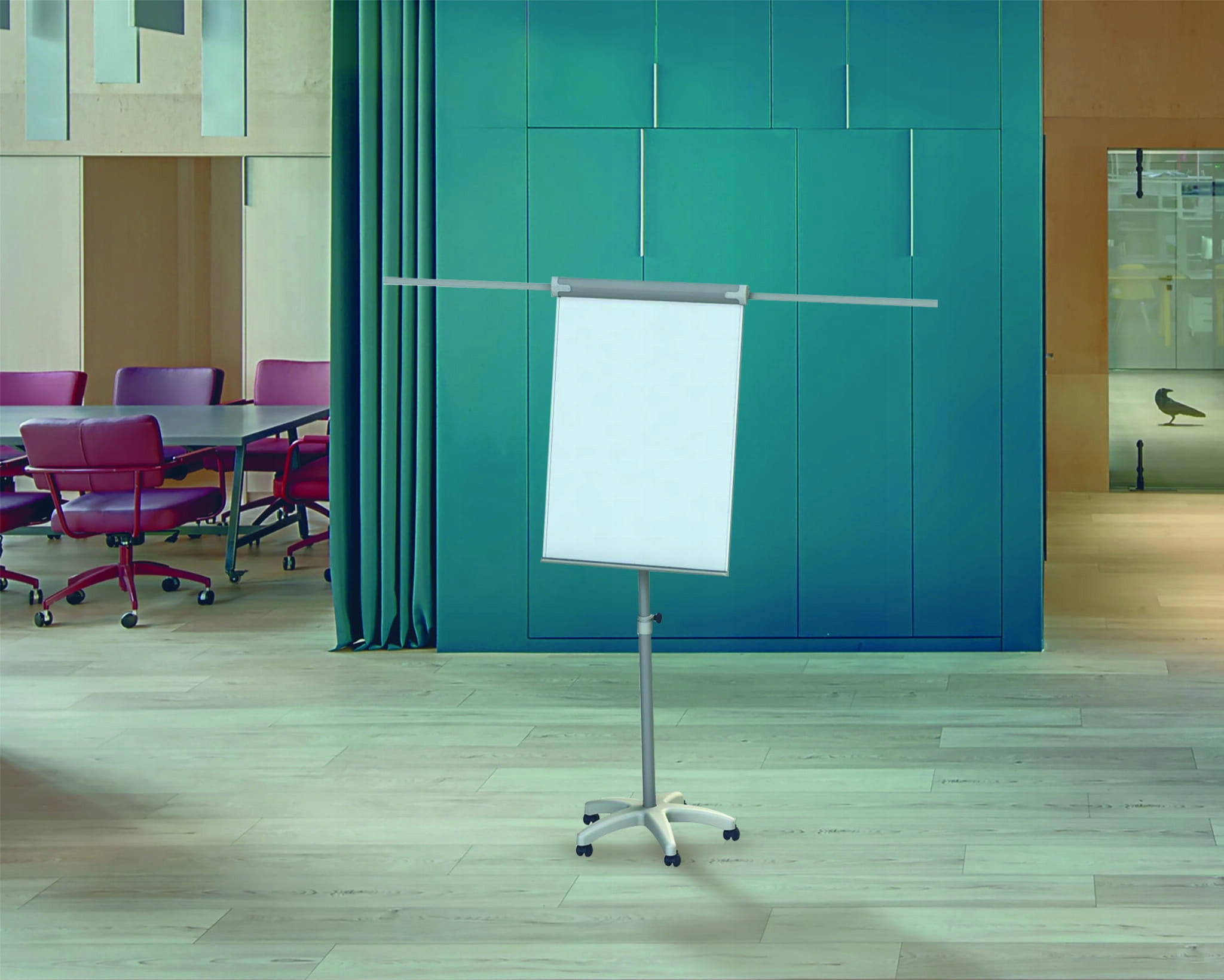 Мобильный флипчарт дополнительно оснащен двумя выдвижными кронштейнами, на которые можно подвешивать листы бумаги, оставляя легко стираемую поверхность для быстрых заметок. Листы бумаги крепятся к рукам с помощью магнитов. Флипчарт позволяет быстро и легко записывать и представлять наиболее важную информацию. Это также отличная альтернатива доскам, которые зачастую невозможно установить во всех помещениях, где проводятся деловые встречи. Флипчарты легко переносить, что является дополнительным преимуществом.
